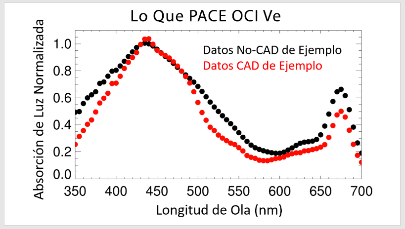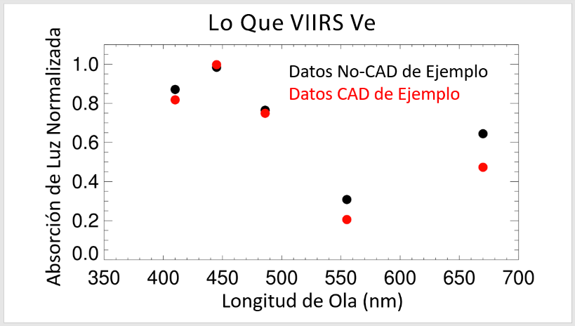 La comparación entre el OCI y un sensor de color oceánico previo, como la Suite de Radiómetros de Imágenes en Infrarrojo Visible (VIIRS por sus siglas en inglés) a bordo del satélite Suomi NPP, lanzado en 2011, resulta abrumadora. VIIRS recopila datos en cinco bandas visibles. En la gráfica izquierda vemos datos VIIRS, que se observan como puntos de datos individuales que representan condiciones de floración de algas nocivas (HAB) en color rojo y no nocivas en color negro. En contraste, la gáfica derecha, muestra una simulación de datos OCI, como resultado se observa una imagen mucho más completa, ilustrando los matices entre los espectros de los dos grupos, ayudando en su identificación.