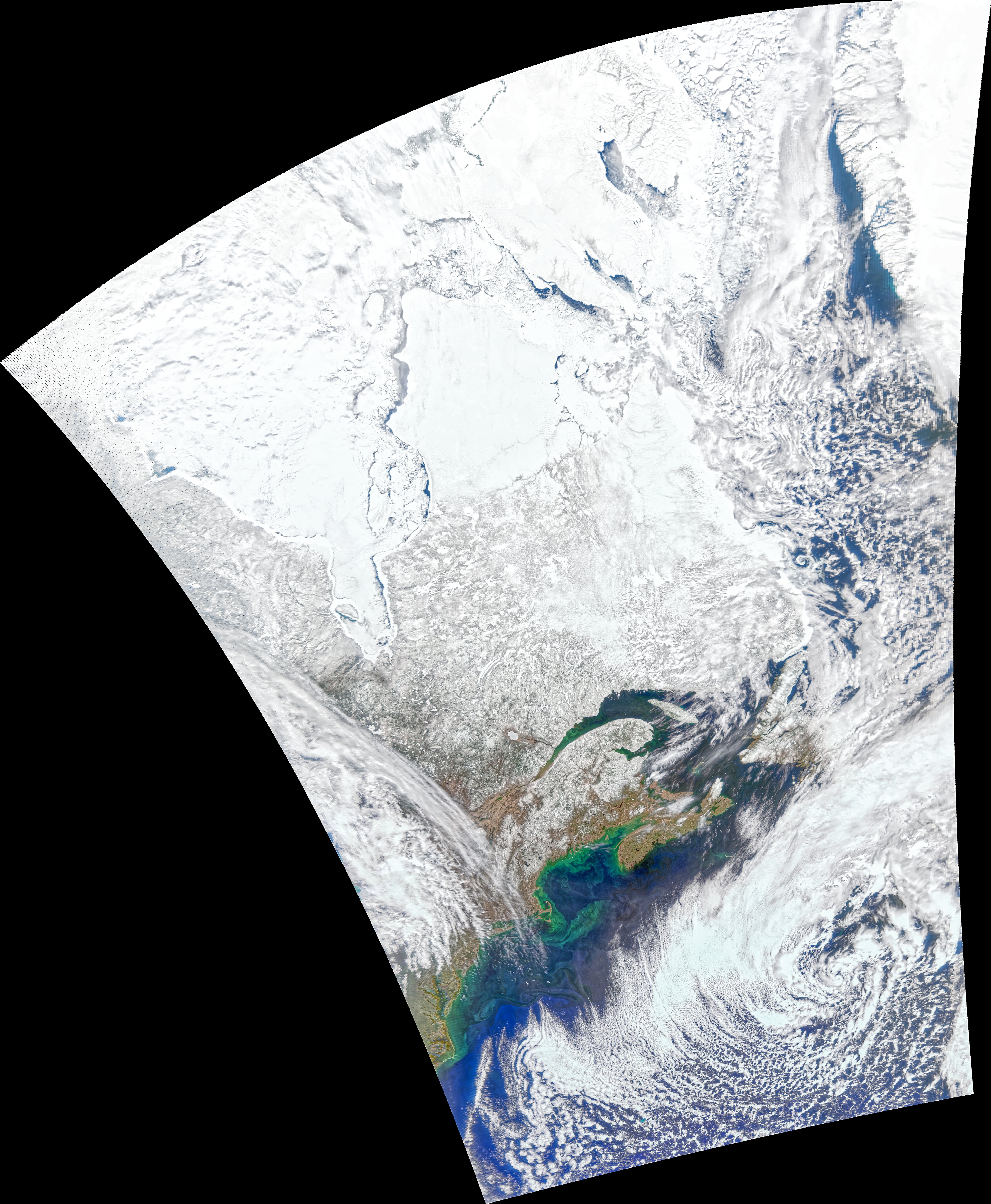 Bounded by the United States and Canada, the Gulf of Maine is seen in the center of this image. Georges Bank, a relatively shallow area known for its productive fishing grounds, is located east of the iconic hook-shaped Cape Cod. This image was taken by the Ocean Color Instrument (OCI) sensor aboard the PACE satellite on April 8, 2024.