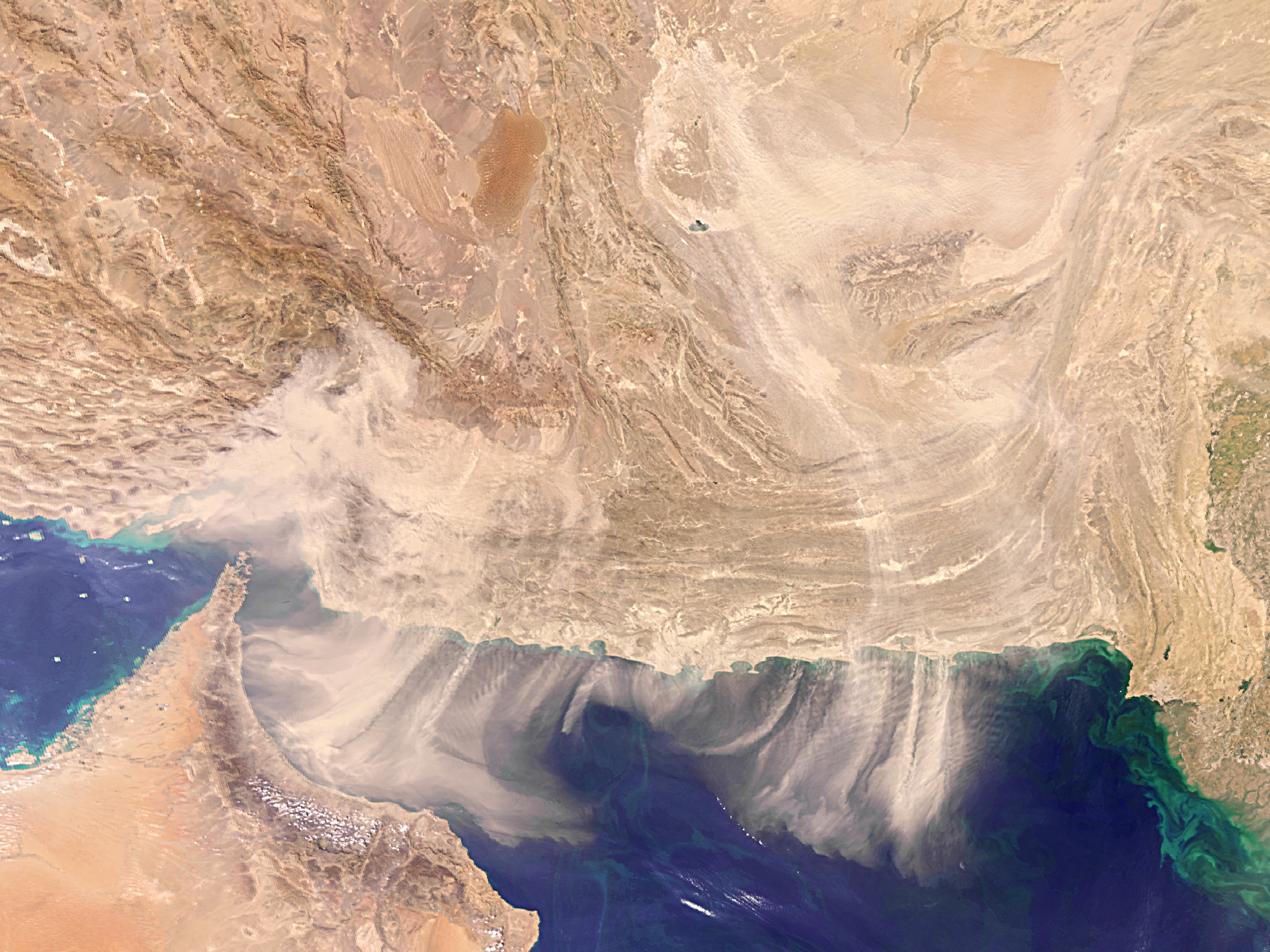 Winds blowing dust from southern Iran toward Africa obscure the view of the Gulf of Oman. Nutrients within dust can fuel blooms of microscopic algae known as phytoplankton. When these blooms occur, they would be visible as green areas within the sea of blue. This image was taken by the Ocean Color Instrument (OCI) sensor aboard the PACE satellite on November 4, 2025.