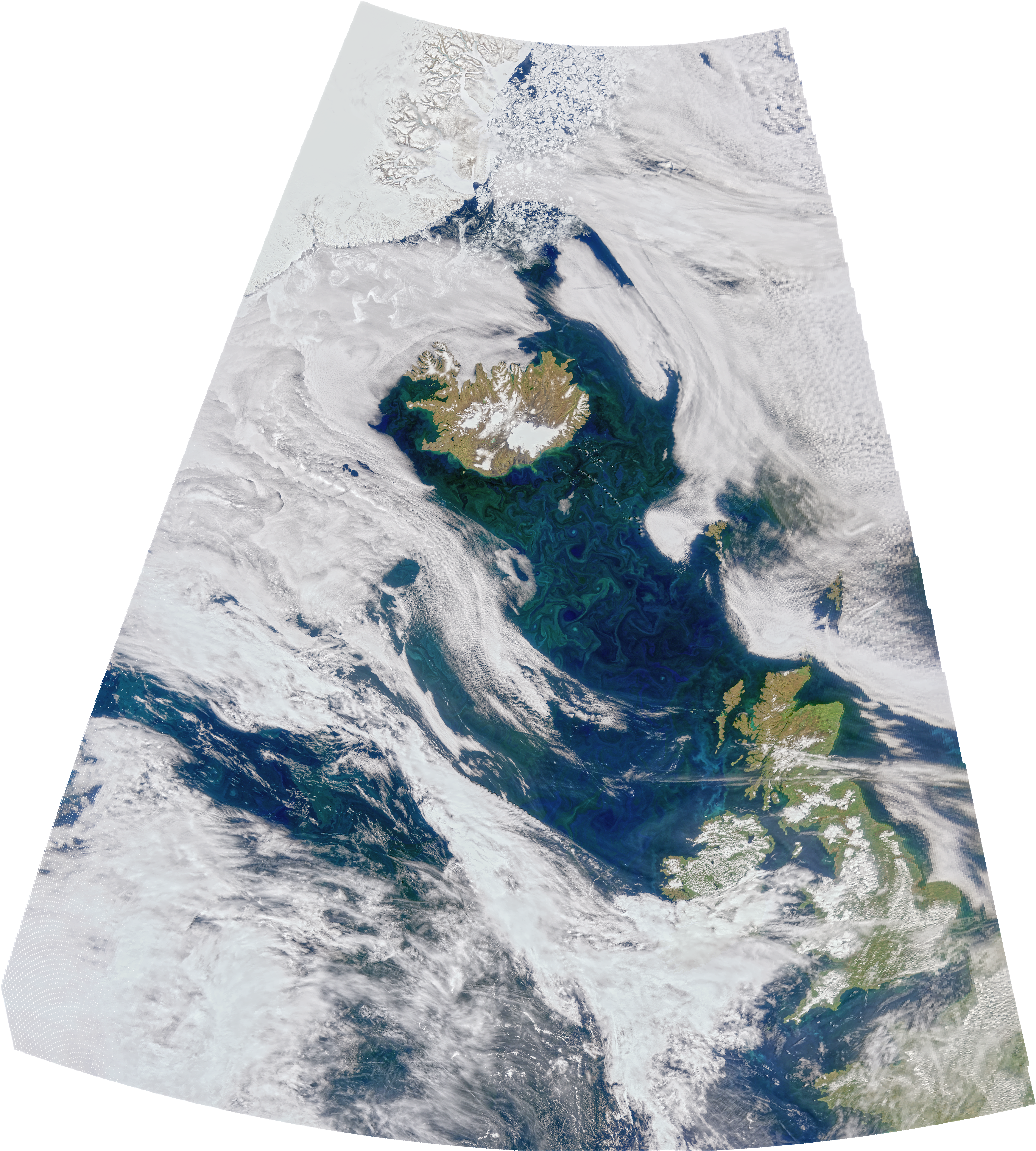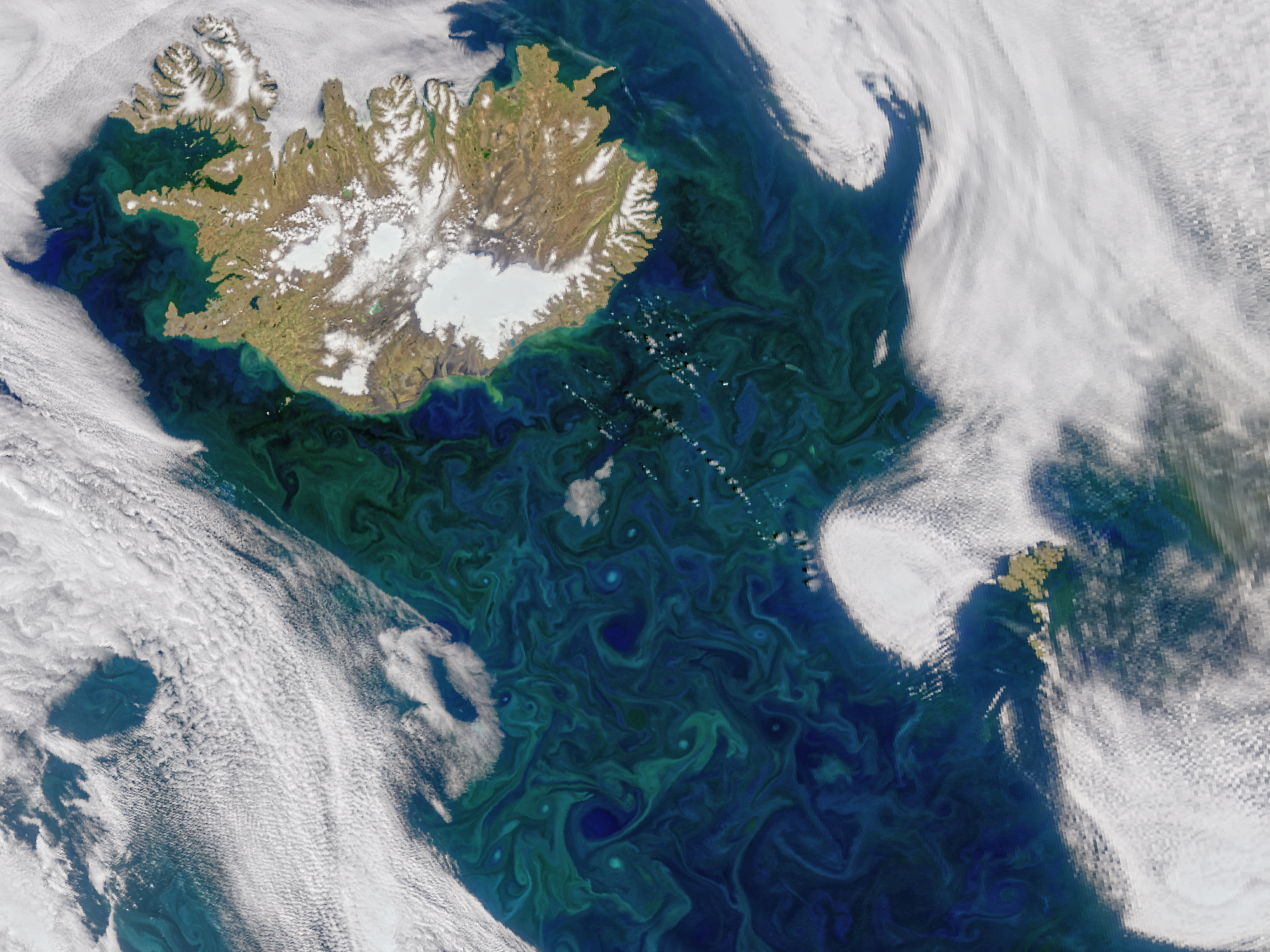 A break in the clouds reveals wisps and swirls of high primary productivity off the southern coast of Iceland. Green, aqua, and light blue colors indicate high concentrations of microscopic algae known as phytoplankton, which bloom in the spring when more sunlight becomes available. This image was taken by the Ocean Color Instrument (OCI) sensor aboard the PACE satellite on May 20, 2025.
