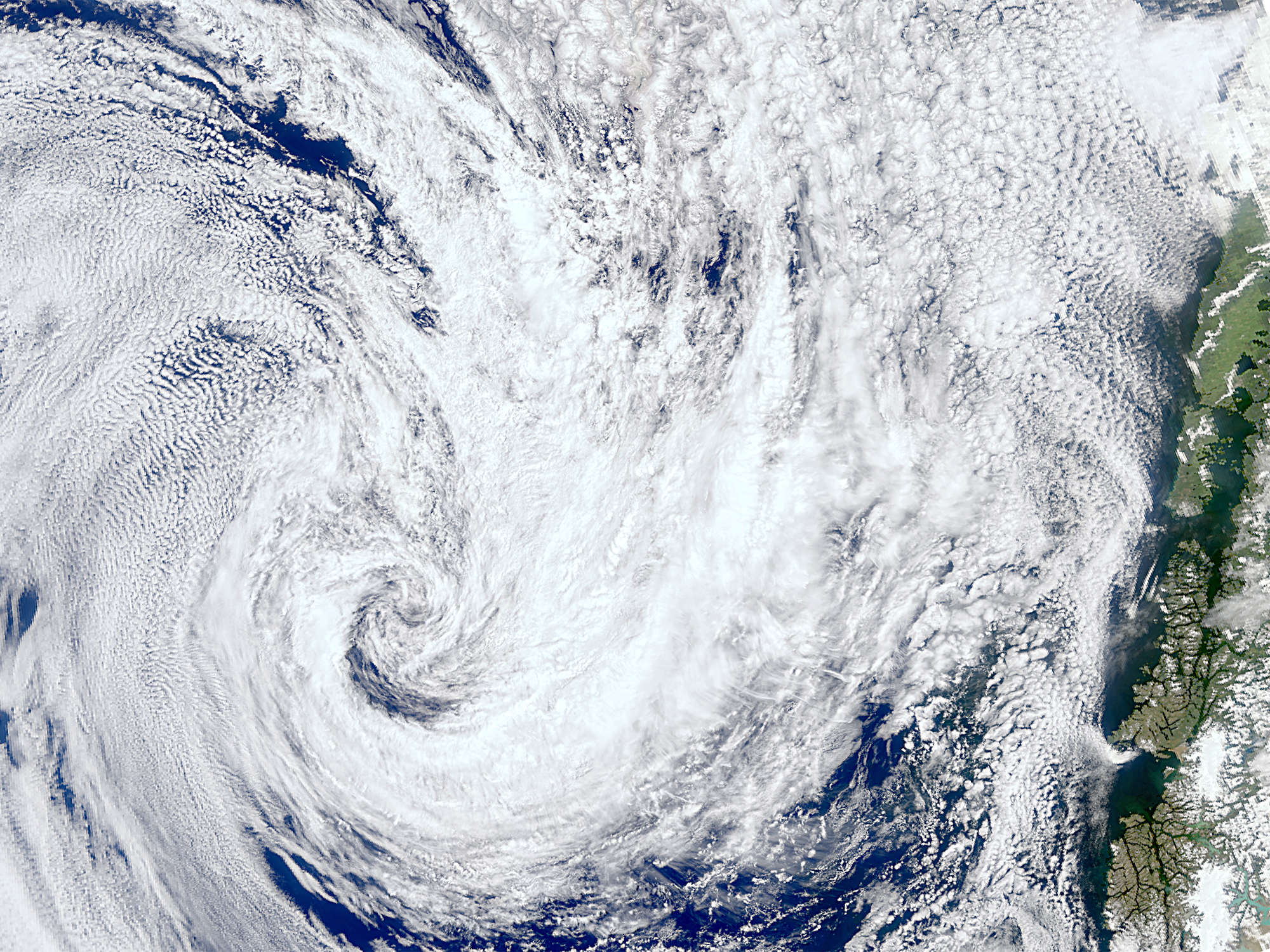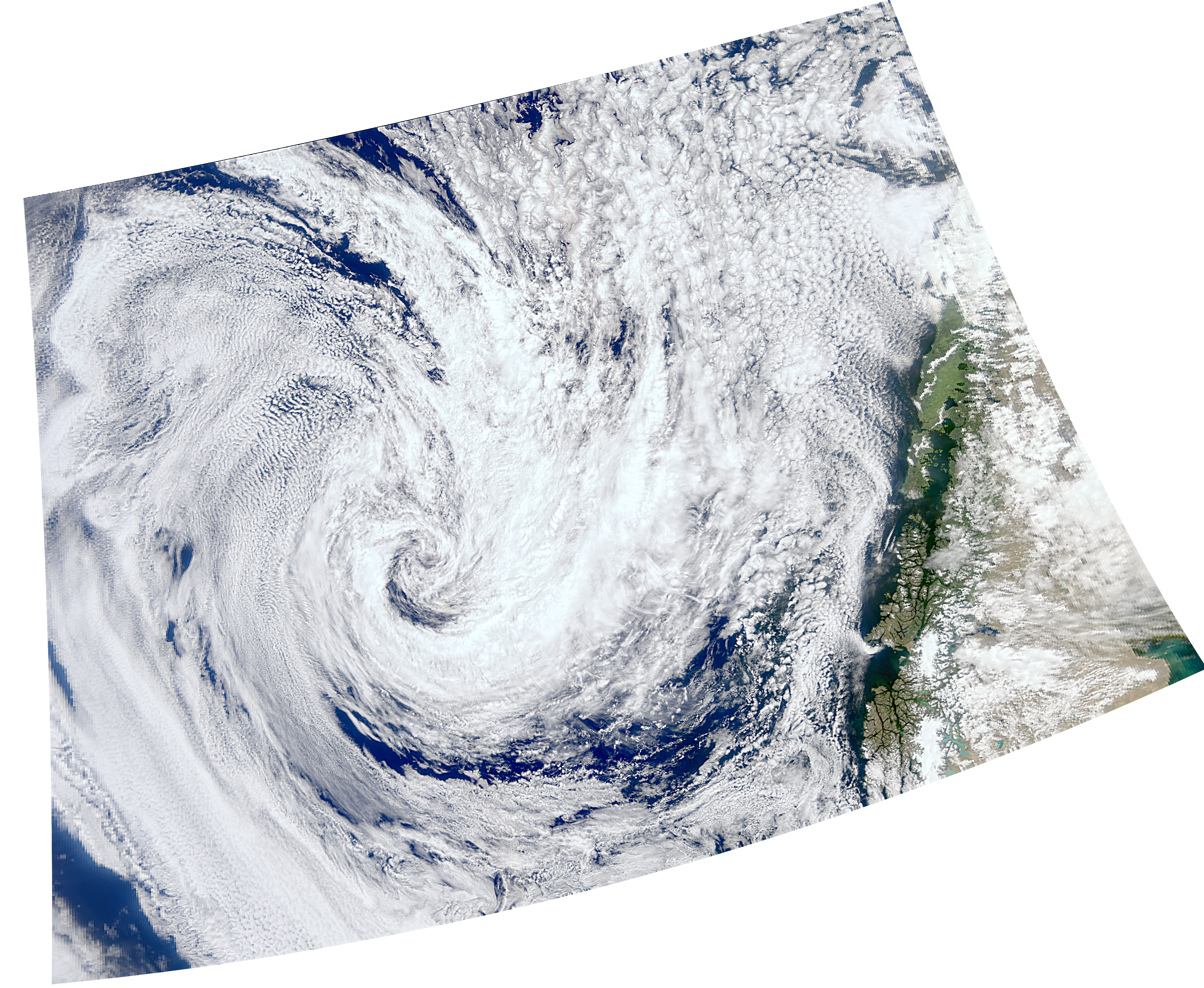 A swirling storm – which dissipated quickly – is seen off the west coast of Chile. At right, the rugged coastline, snow-capped Andes Mountains, and some glacial lakes are visible in this image, taken by the Ocean Color Instrument (OCI) sensor aboard the PACE satellite on November 6, 2025.