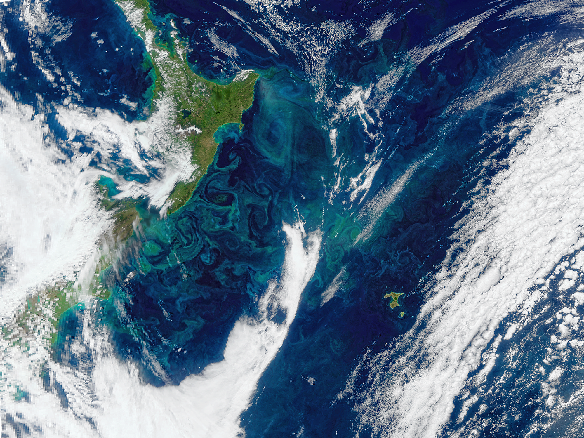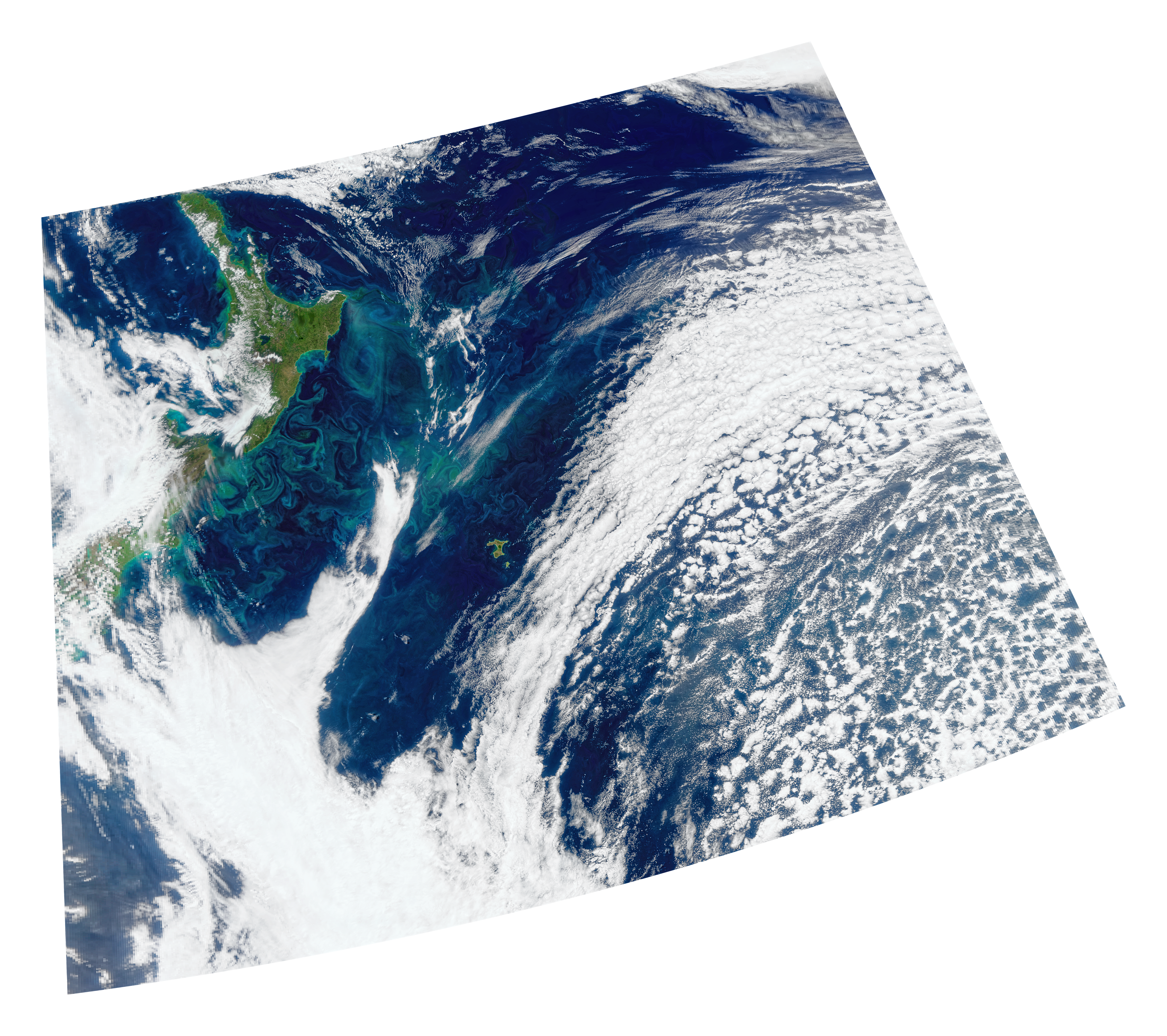 A summer phytoplankton bloom is seen off the east coast of New Zealand, extending to Chatham Islands (Rēkohu in Moriori, Wharekauri in Māori) near the center of the image. Blooms in this region can be driven by a mix of ocean currents and the unique underwater topography of the Chatham Rise, where nutrient-rich Antarctic waters meet warmer subtropical currents. The Chatham Islands are located about 800 km (500 mi) from New Zealand's South Island. This image was taken by the OCI sensor aboard the PACE spacecraft on November 6, 2025.