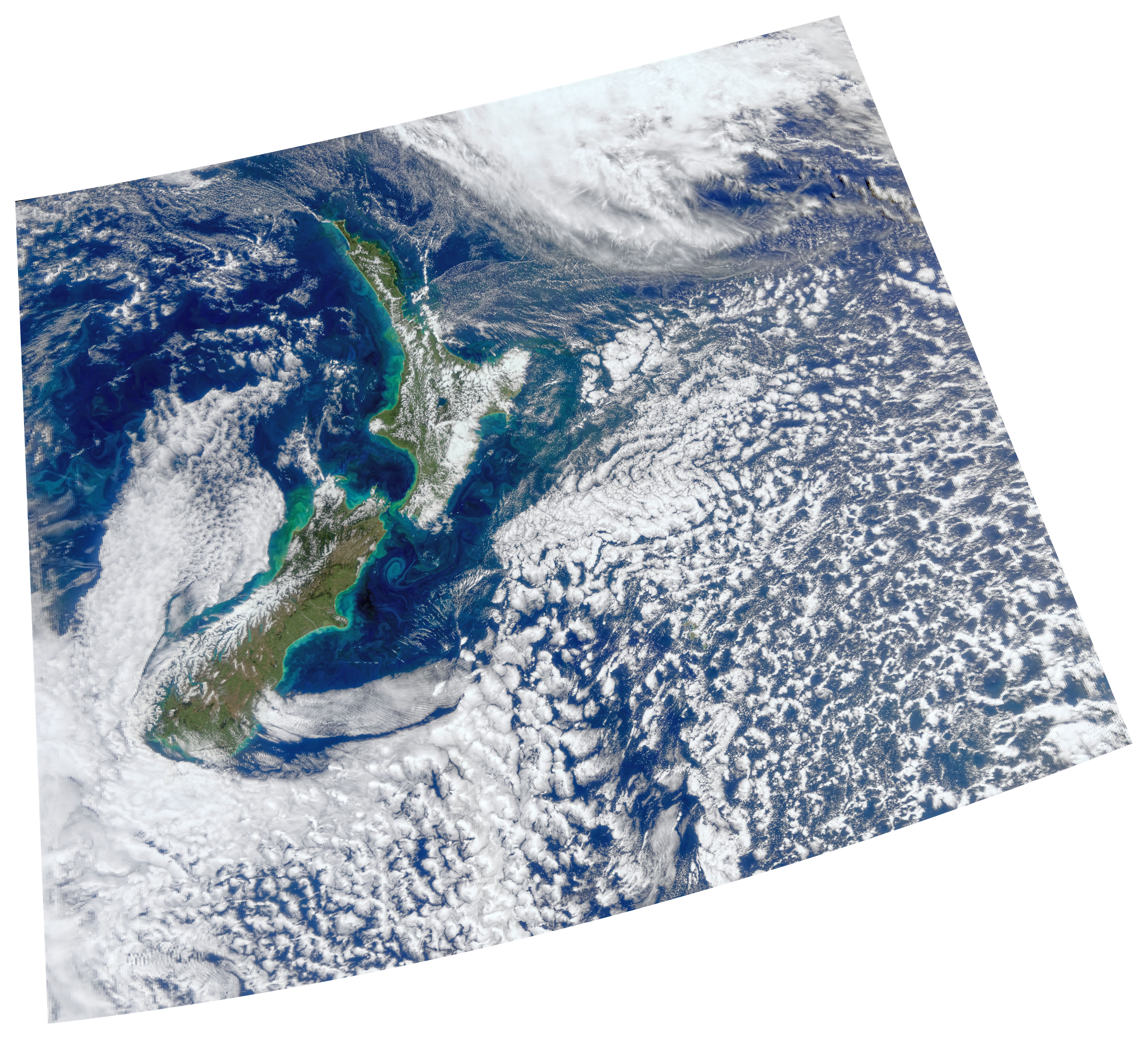 New Zealand's North and South Islands are surrounded by various types of clouds including icy high-level cirrus, open cell cumulus with a "bubbly" appearance, and low clouds that have formed along the islands' terrain. Along the coasts, teal and brown colors indicate turbid waters stirred by tides and sediment-laden outflows from rivers. Lighter blue swirls seen to the east of the islands indicate high ocean productivity associated with ocean eddies. This image was taken by the OCI sensor aboard the PACE spacecraft on November 1, 2025.