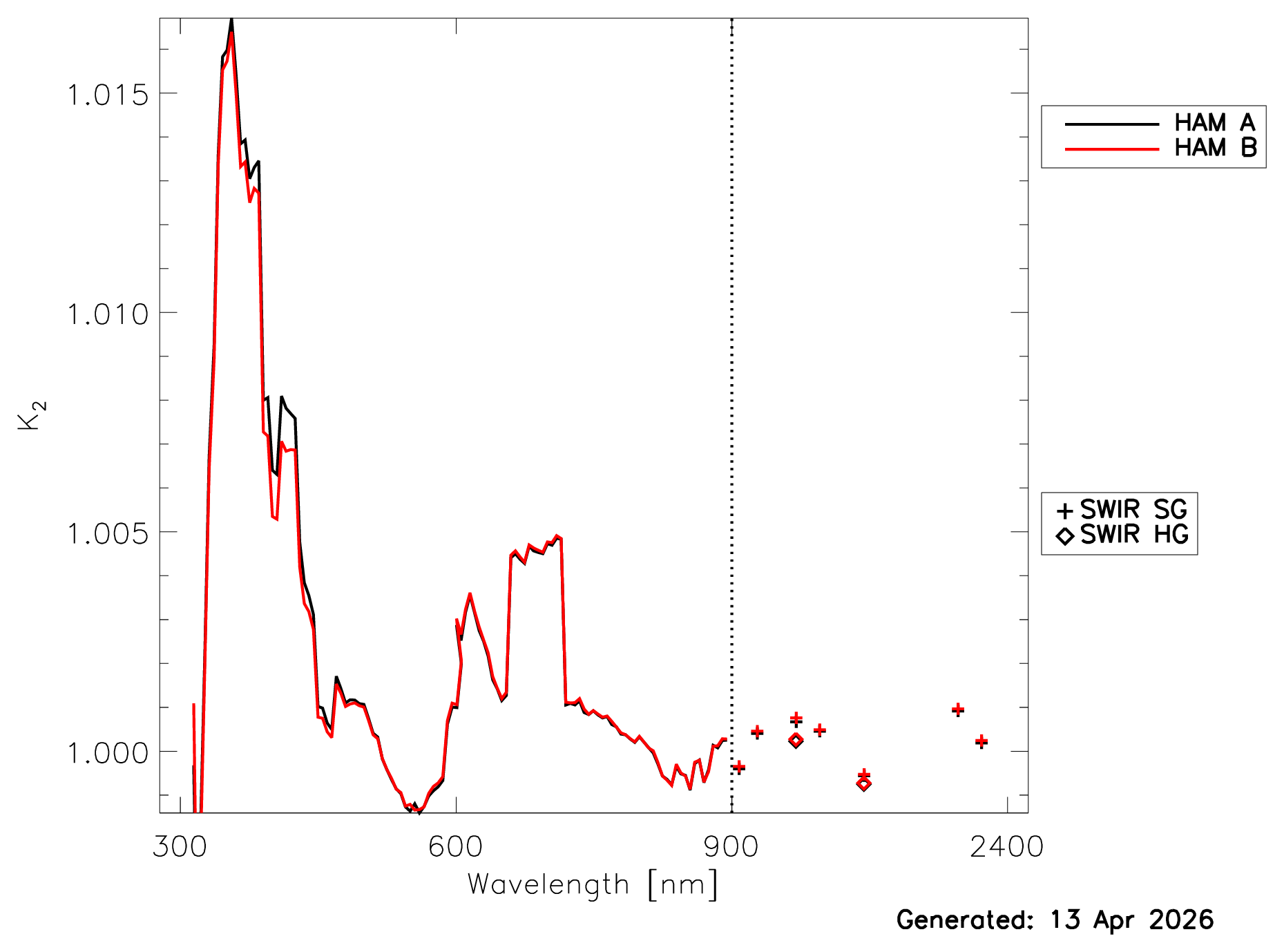 Fig. 2a shows the most recent on-orbit measurements of K2. K2 is plotted as a function of time for each OCI band (threshold spectral aggregation) in this PDF file.