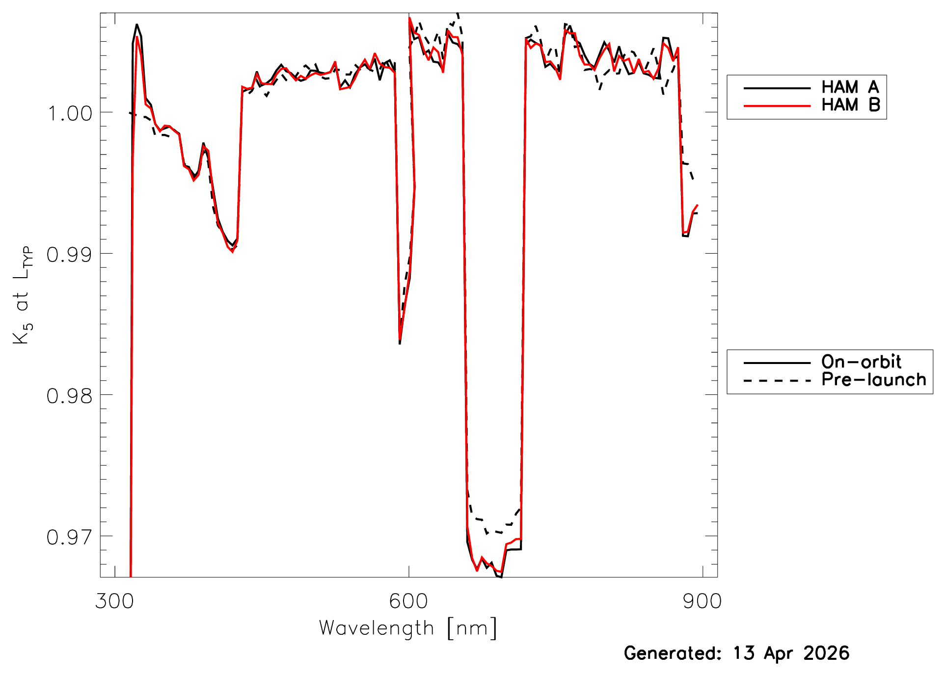 The linearity parameter K5 for the OCI hyperspectral bands is trended on-orbit via a dim diffuser and a special OCI aggregation mode called ‘progressive Time-Delay-Integration’, see Mcintire et al., 2024. Fig. 5a below shows the most recent results for K5 at typical radiances Ltyp. The K5 at Ltyp as a function of time are shown here for both HAM (Half-Angle Mirror) sides. Note that the difference between the two HAM sides is likely an indication of the noise in the results and not a real difference in linearity.