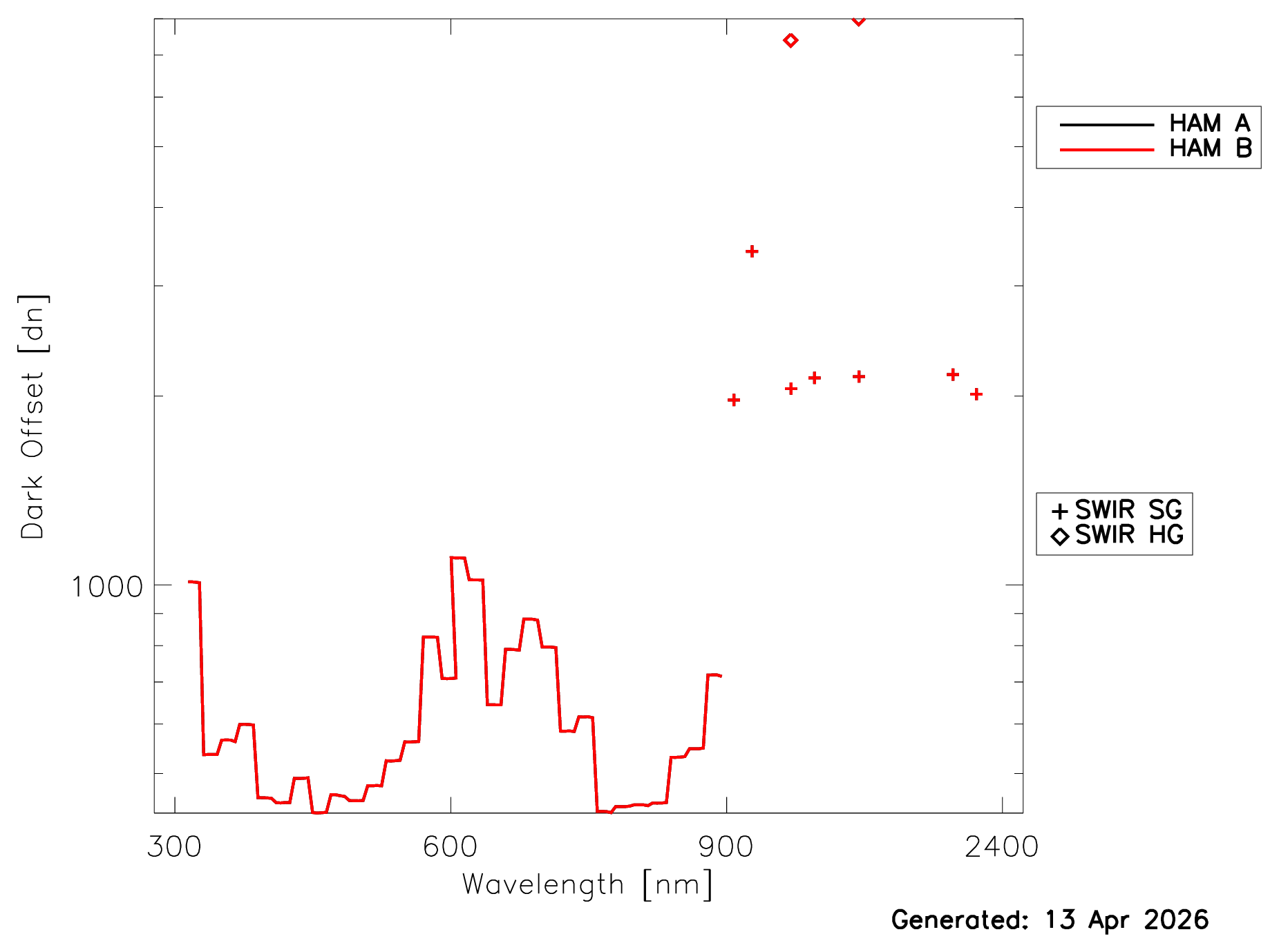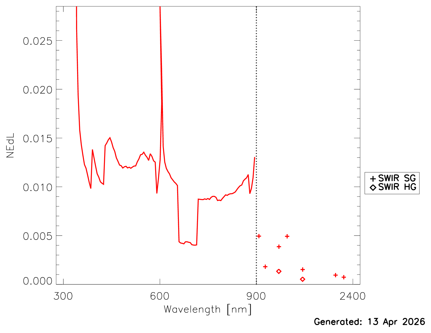 The OCI noise performance can also be evaluated with measurements when no light enters the telescope (‘dark measurements’). These measurements are taken every scan of the telescope when the telescope is pointing at a dark surface inside the instrument. Fig. 1c shows the ‘Noise equivalent delta Radiance’ (NedL) from the latest measurement. The temporal trend of the noise (expressed in terms of dn) as a function of time is provided here. The dn from the dark measurements are subtracted during the calibration process. Fig. 1d shows the latest dark measurements, the trend over time is shown here.