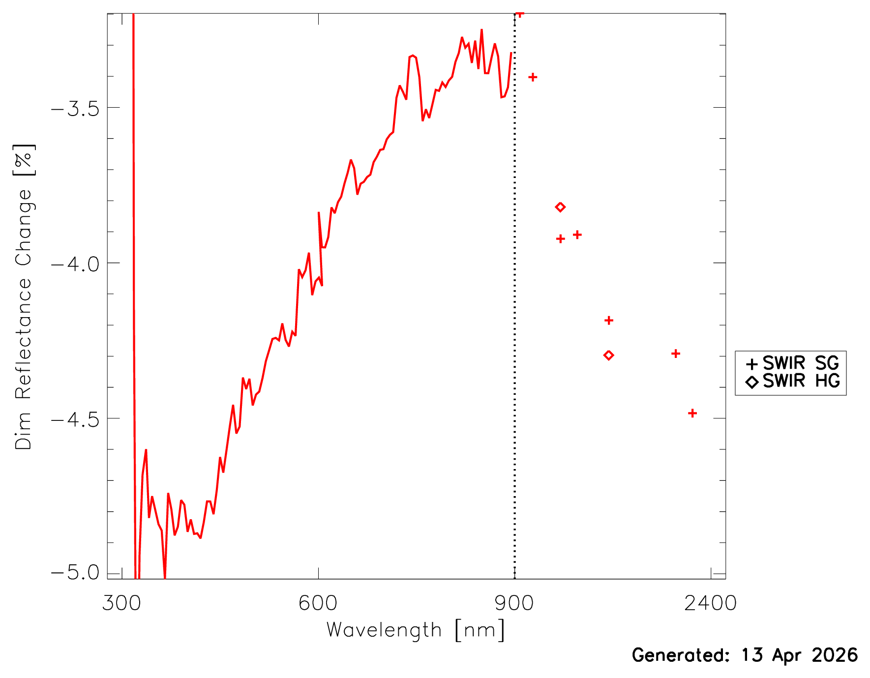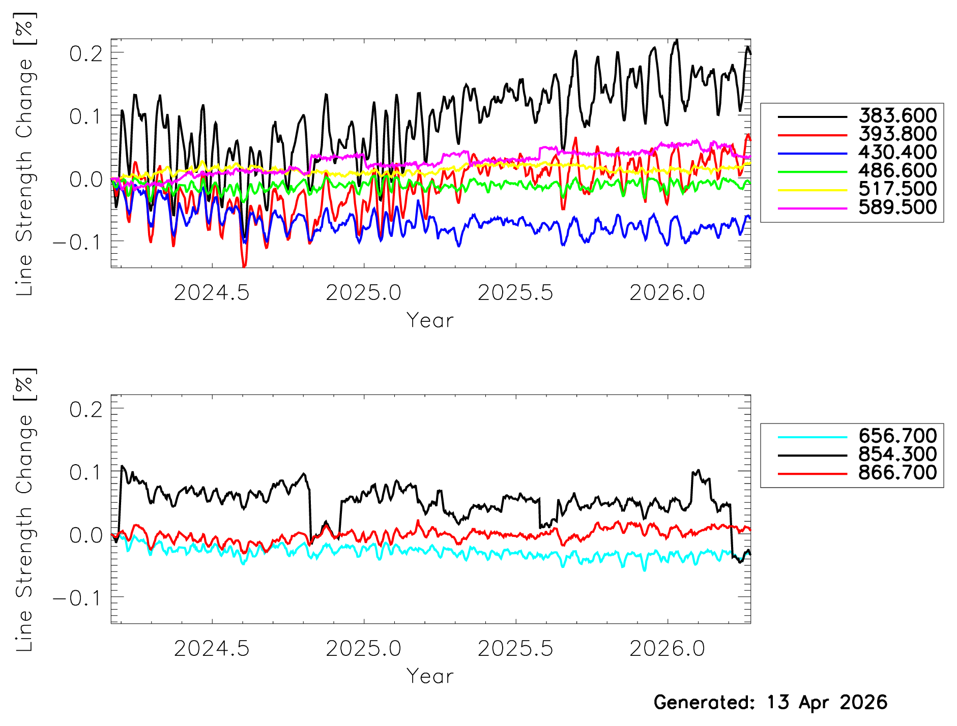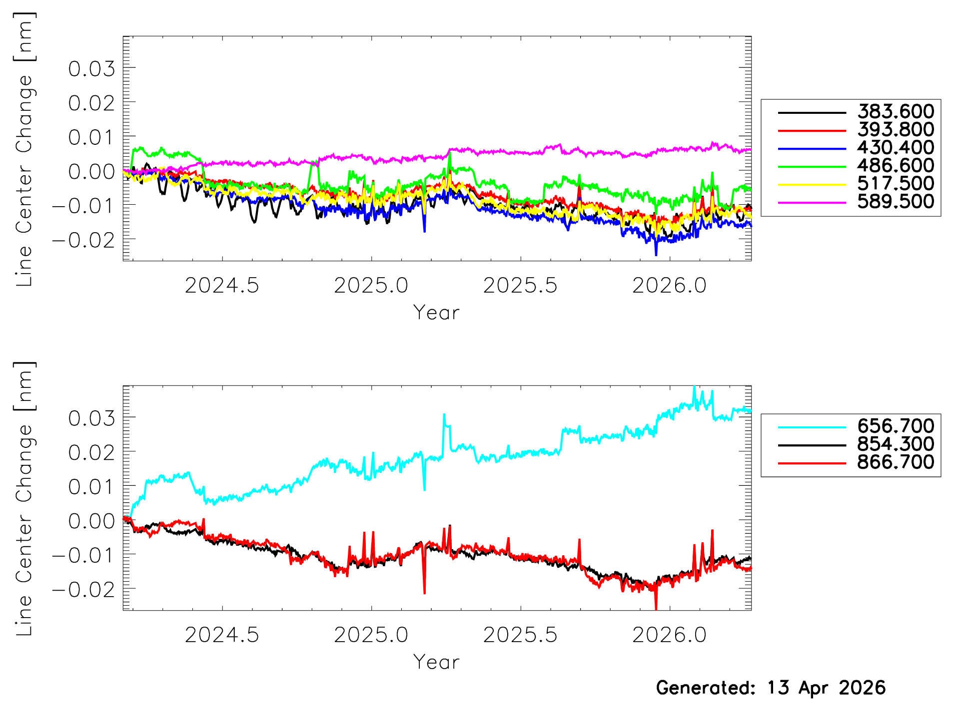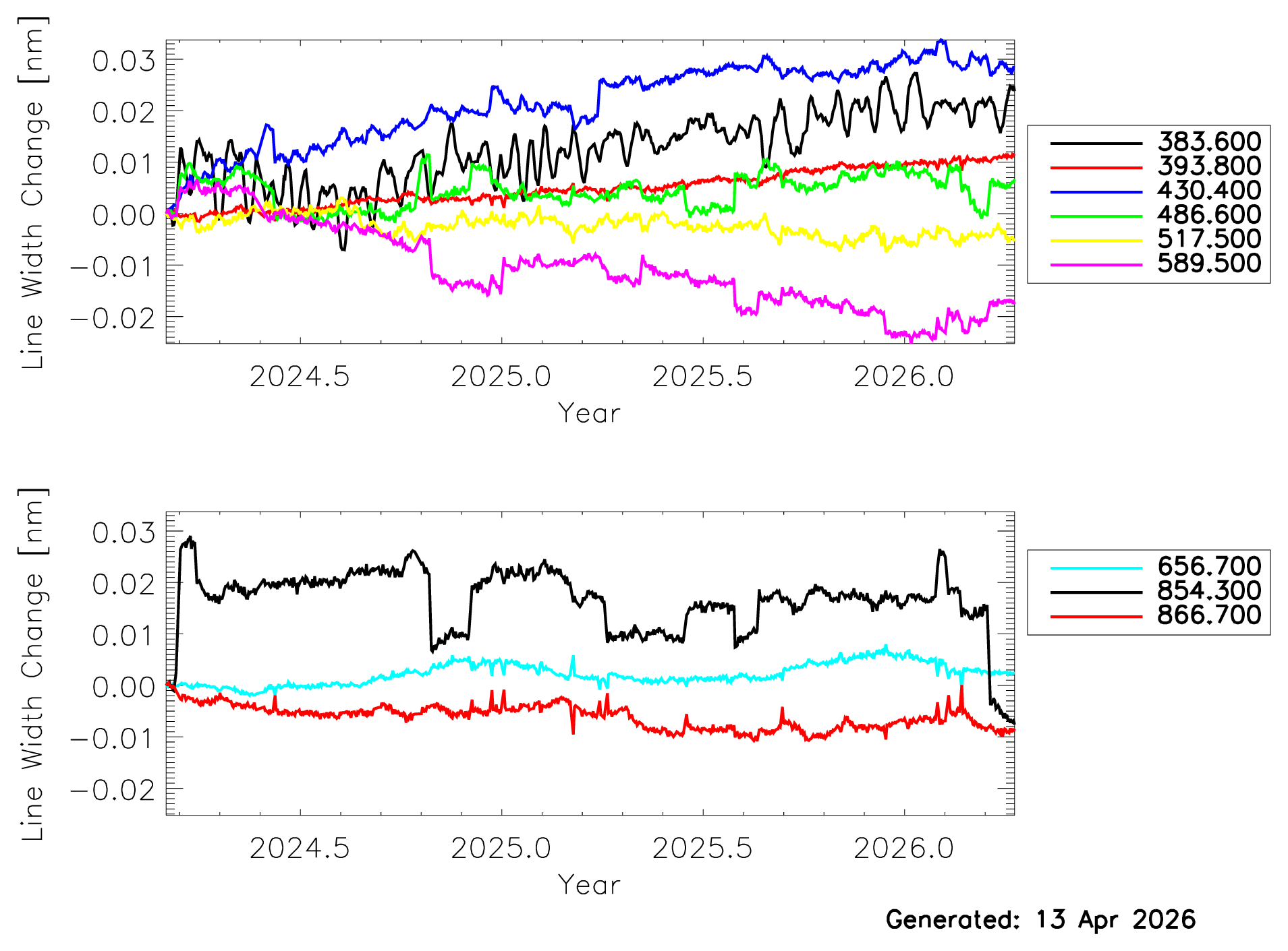 We believe that the current trend in the data (less than 0.1nm for line width change and less than 0.5% line strength change) does not imply a significant change in the spectral characteristics of the instrument.