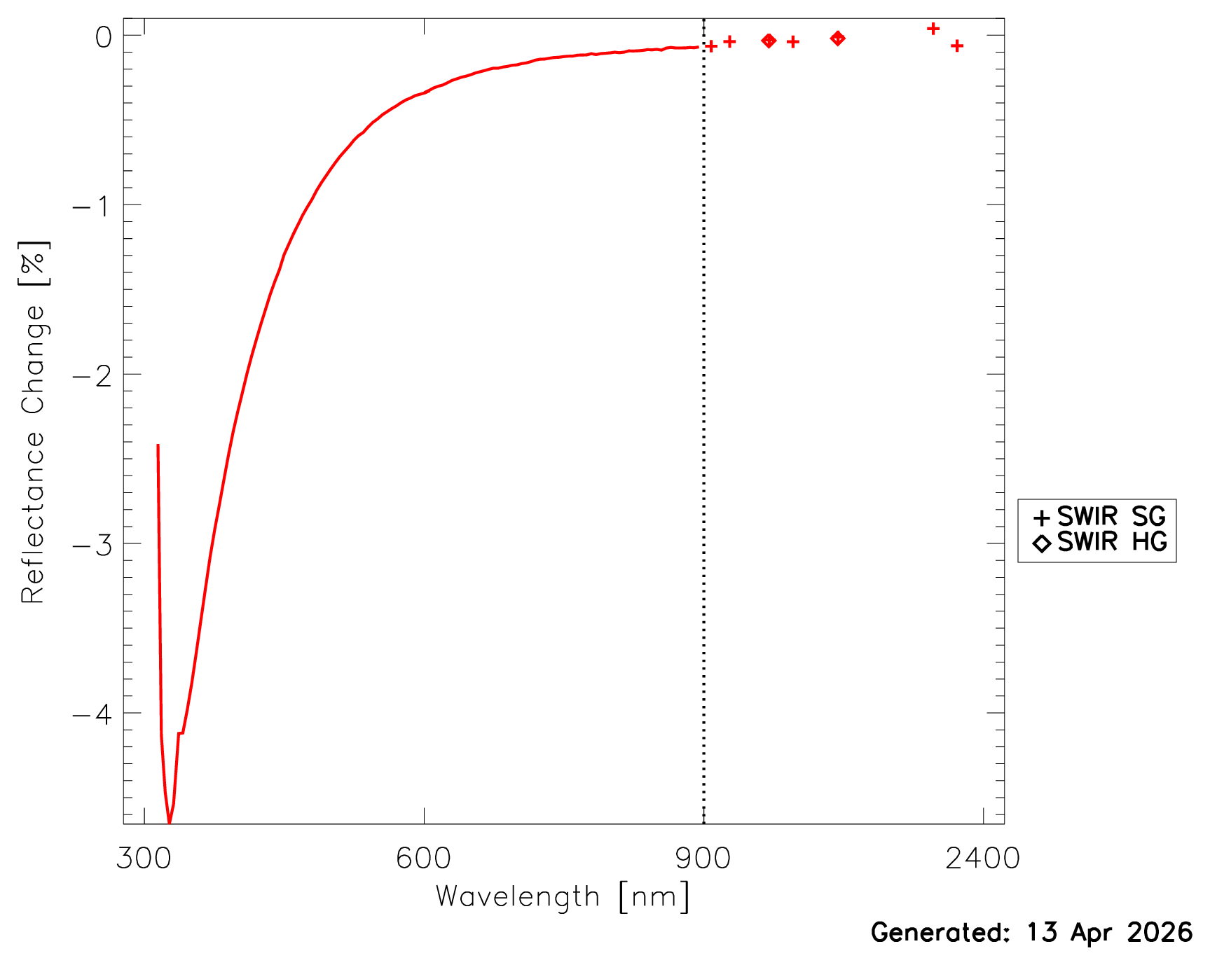 OCI has 3 on-board solar diffusers: two bright diffusers for gain trending, and one dim diffuser for linearity trending. One of the bright solar diffusers is measured daily, the other monthly. For PACE processing versions 3.x, it was assumed that the reflectance of the monthly bright solar diffuser did not change over time. (Note that for reprocessing 4, it is planned to model the degradation of the monthly diffuser as well.) This assumption allows us to calculate the change of the reflectance of the daily solar diffuser, which is shown in Fig. 10a. A value of -1.0% in Fig. 10a corresponds to a relative reduction of the diffuser reflectance by 1% (e.g. from a reflectance of 0.3 to 0.297). The reflectance of the daily diffuser has decreased significantly in the blue, but hardly at all in the SWIR. Note that the results below 325nm are very unreliable due to the low optical throughput of OCI at those wavelengths. The reflectance change versus time is shown in this PDF.