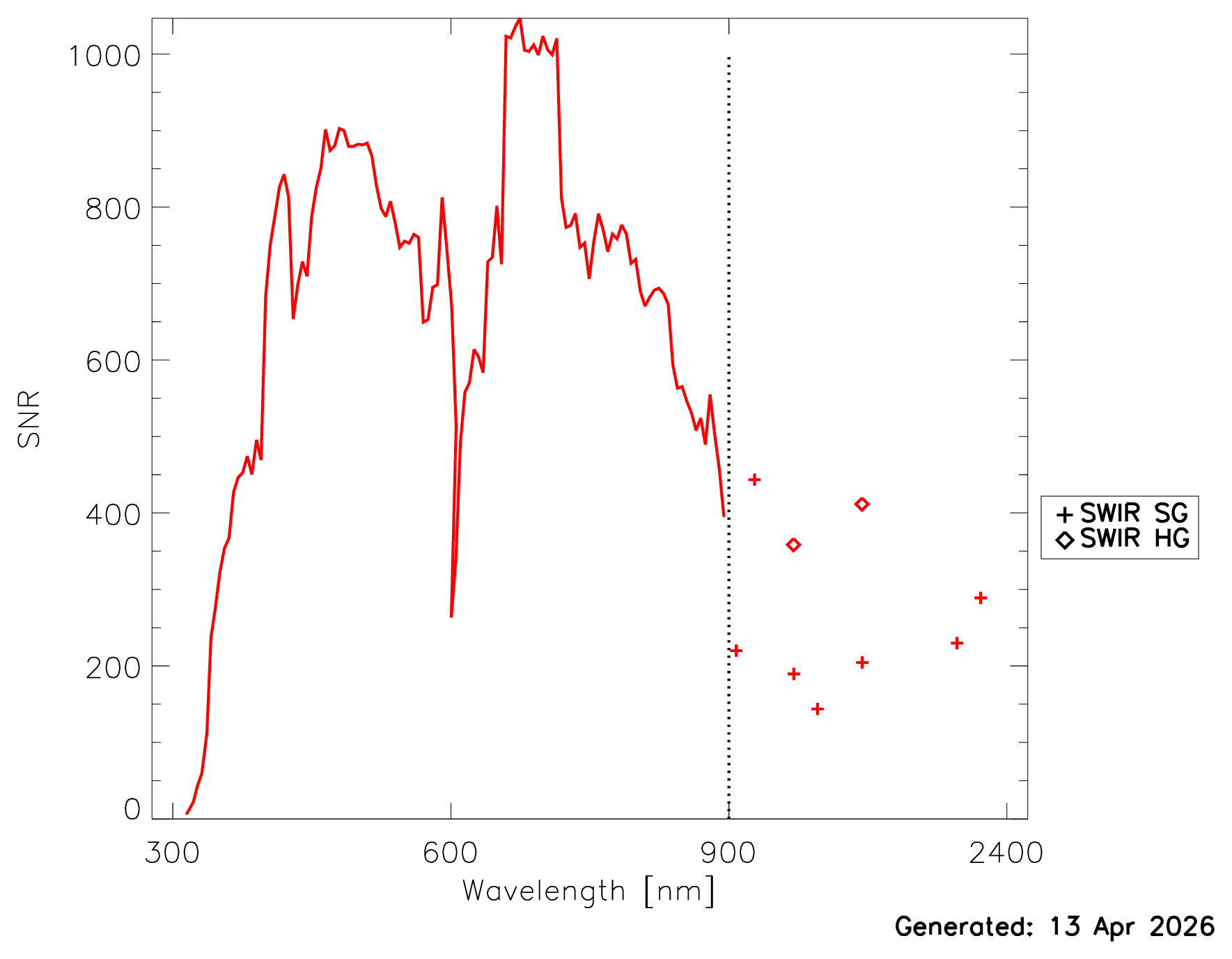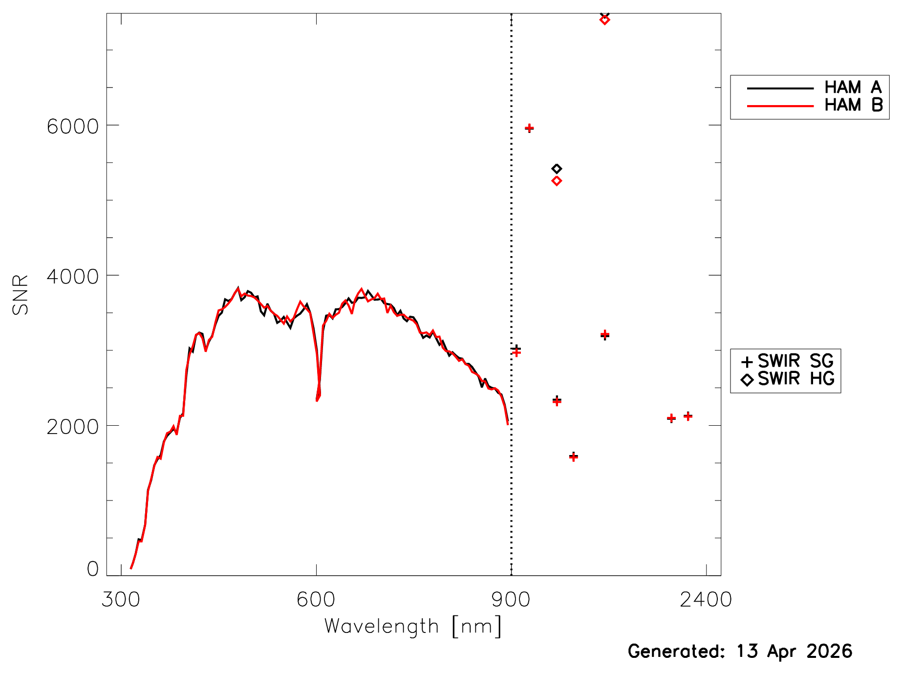 The SNR as a function of time are provided for the BCT and DCT. The SNR from the most recent BCT and DCT measurements are shown in Fig. 1b. The SNR from the BCT are more representative for a cloud radiance, the SNR from the DCT are more representative for an open ocean radiance. The prelaunch SNR evaluated at typical ocean radiances are shown in Fig. 13 in Meister et al., 2024. For specific radiance levels, the prelaunch SNR can be calculated via an equation and coefficients provided here.