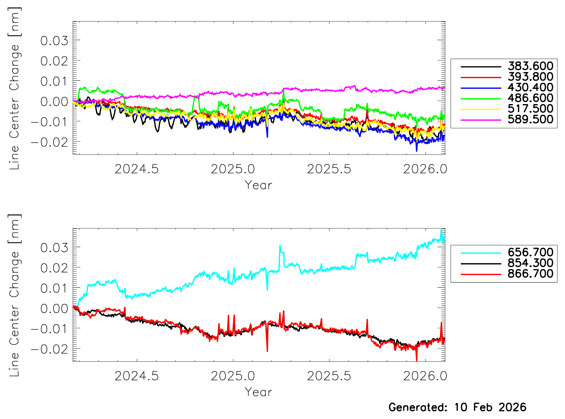 The OCI spectral calibration is monitored on-orbit by Fraunhofer lines in the radiances reflected off the bright solar diffuser. The methodology has been described by Eplee et al., 2024. Fig. 4a shows results for the blue Focal Plane Assembly (FPA) and the red FPA. It is likely that discontinuities (see e.g. 526nm) are due to the fitting approach and are not a sign of actual change in the spectral calibration. The temporal trends shown in the plots below are well within the On-Orbit Allowable Spectral Stability requirement of 0.5nm per year.