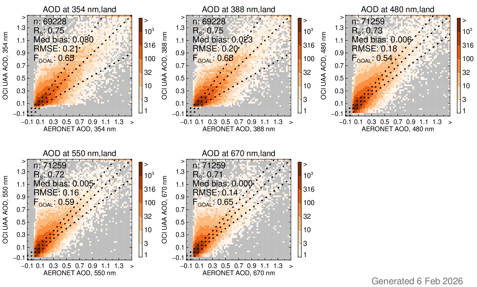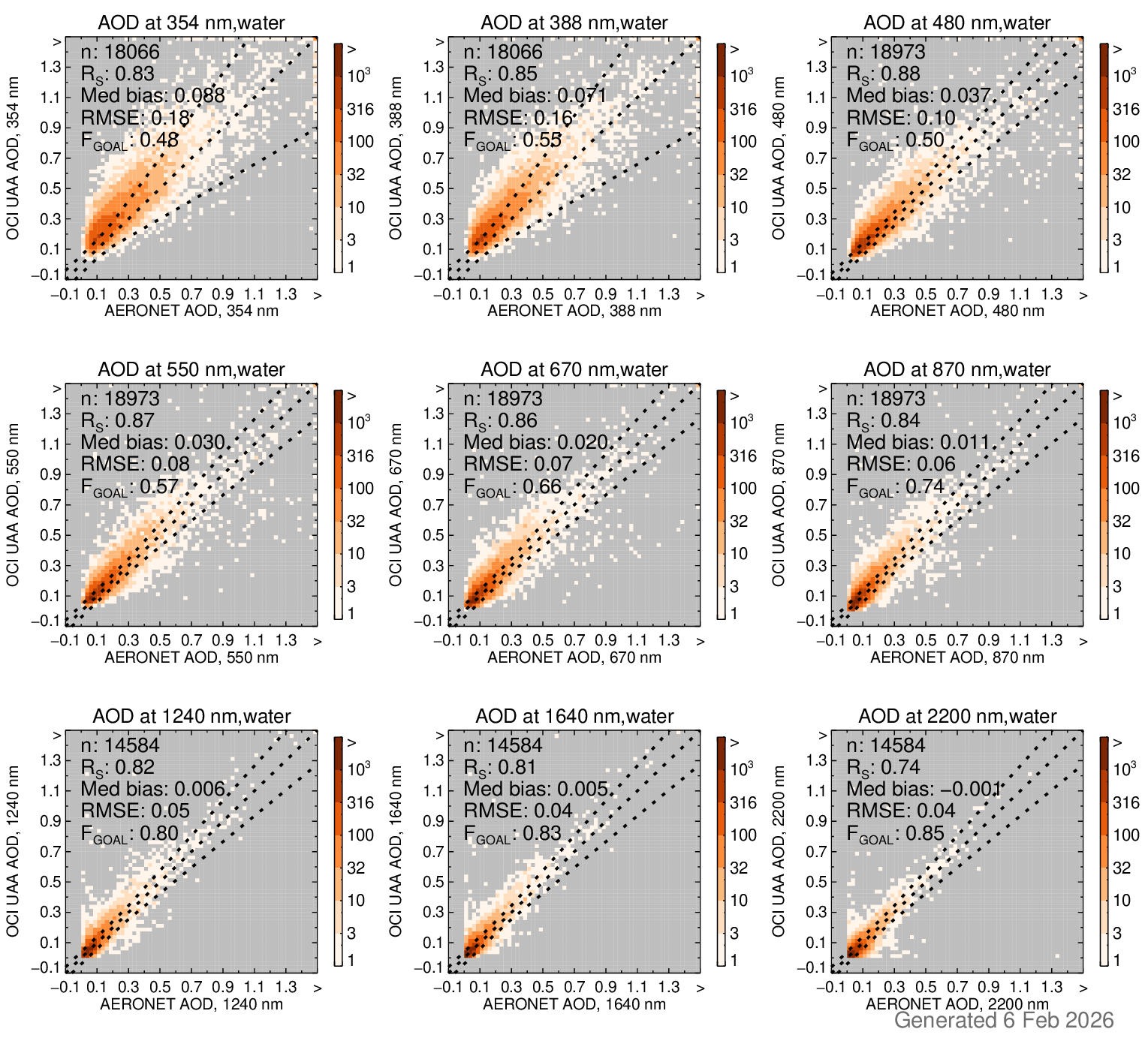 This page shows comparisons between aerosol properties retrieved by the OCI Unified Aerosol Algorithm (UAA) and ground-based sun photometers within NASA's Aerosol Robotic Network (AERONET). The UAA makes use of OCI's spectral coverage to combine and expand on the heritage Dark Target, Deep Blue, and near-UV algorithms which have been broadly applied to NASA sensors (Remer et al., 2019).