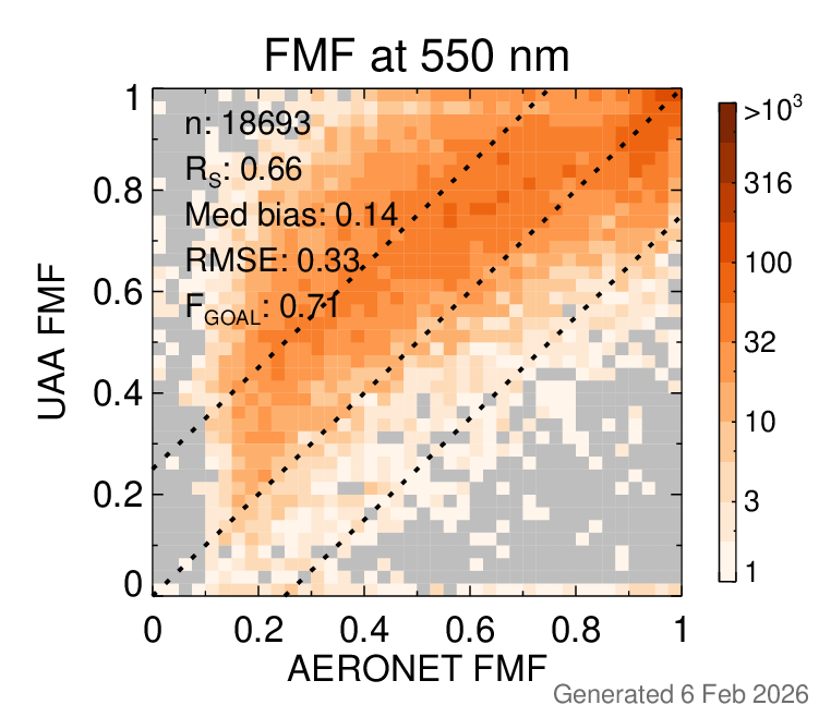 Here we show the fine mode fraction (FMF) of AOD at 550 nm, which the UAA only retrieves FMF over water. The FMF uncertainty goal is 0.25.