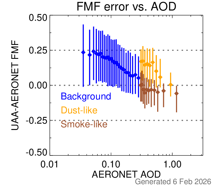 This graphic shows FMF error as a function of AOD at 550 nm. In combination with the results shown above, the positive AOD bias – which diminishes with increasing wavelength – is related to retrieving too high FMF values.