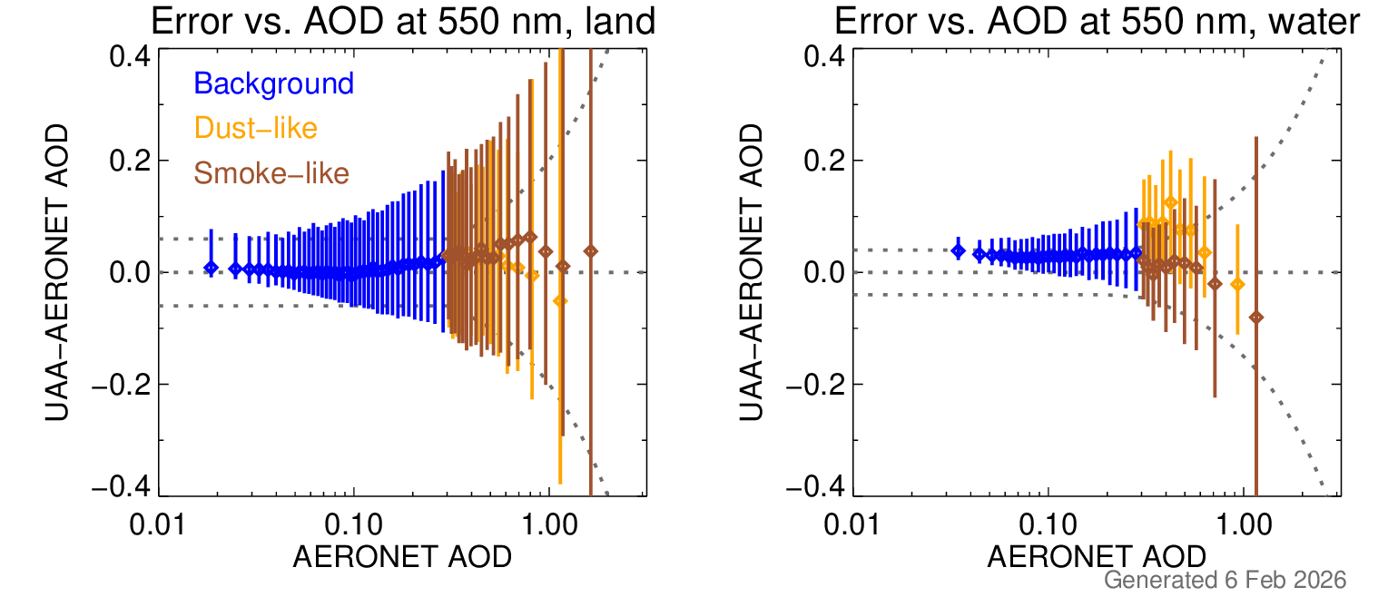 Below, we show how the error in retrieved AOD at 550 nm depends on the AOD at 550 nm for UAA land and water retrievals. The points here are split into three categories, based on the AERONET AOD at 550 nm and Ängström exponent (AE): background (blue; AOD<0.3), dust-like (orange; AOD>0.3, AE<1), or smoke-like (brown: AOD>0.3, AE>1). Points are binned as a function of AOD (with the number of bins set to the nearest integer of the cube root of the number of matchups in each category), and symbols and lines show the median and central one standard deviation of matchups in each bin. Dashed lines show the mission goal uncertainty. This graphic shows little overall bias for retrievals over land (albeit with some site-to-site variation shown in the maps above) but a more persistent positive bias for background and dust-like aerosols over water. As expected, AOD error increases with increasing AO.