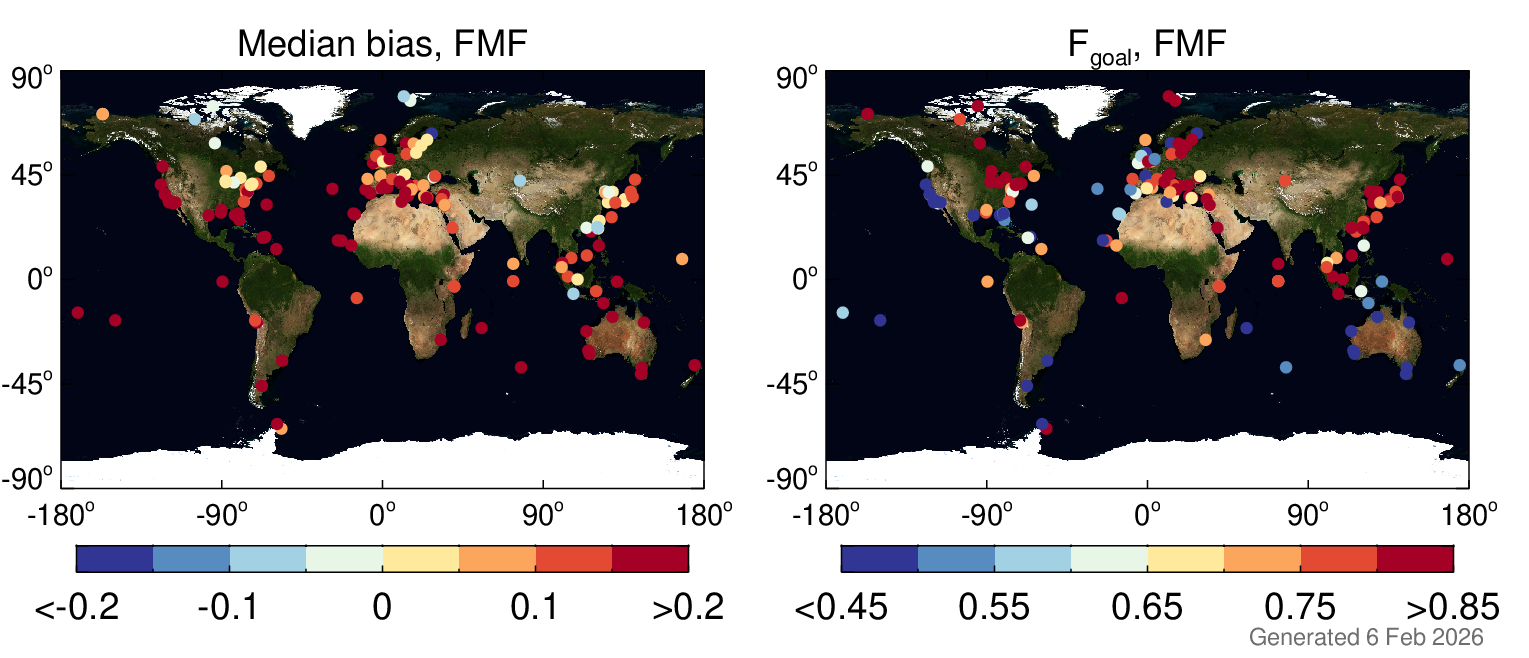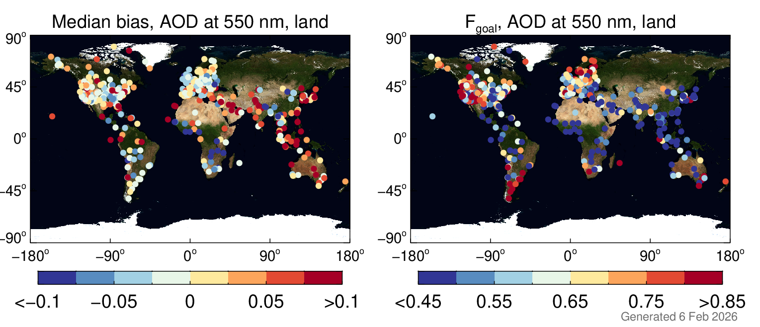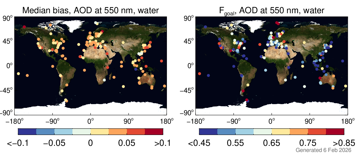 To illustrate regional variations in performance, the maps below show (for 550 nm) the median UAA-AERONET bias and FGOAL for each site. For median bias maps, less intense colors indicate smaller bias. For FGOAL maps, sites where UAA meets or exceeds the mission goal (65% of matchups within goal uncertainty) are shown as warm color dots; cool color dots indicate sites that do not meet the goal.