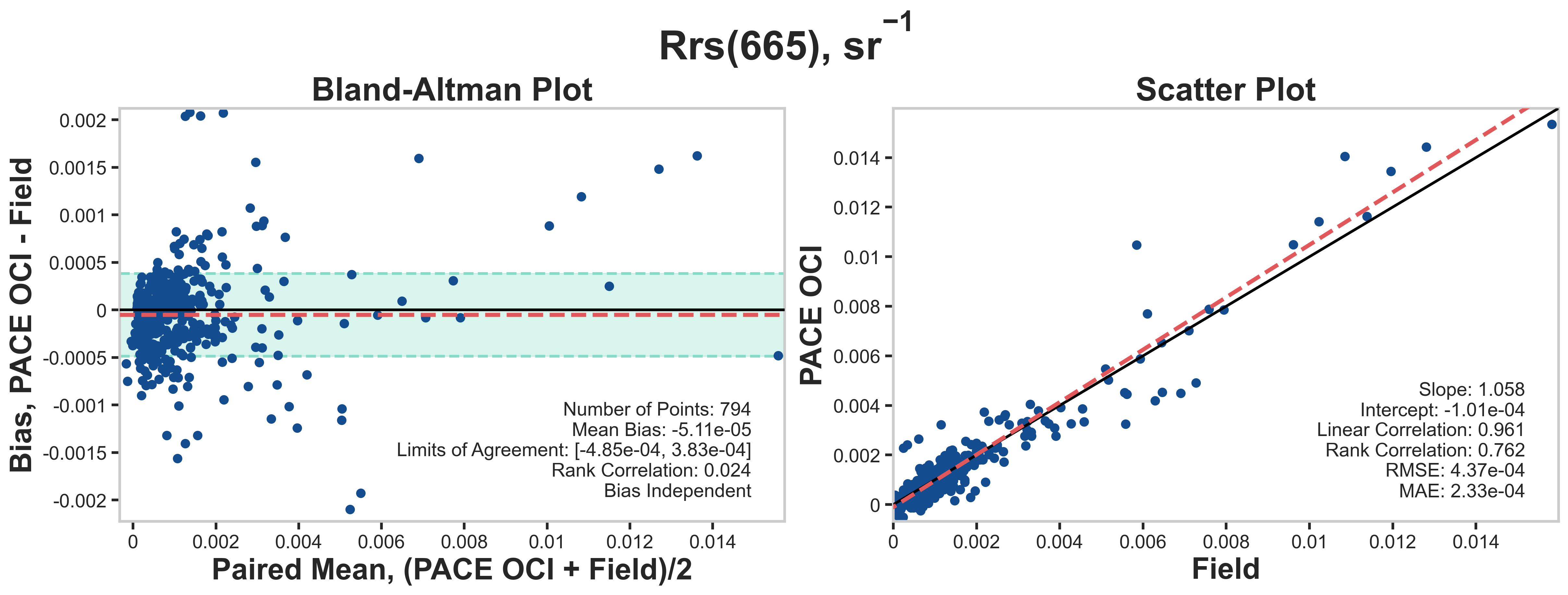 The data plotted below are Bland-Altman plots and Scatter plots for select AOP matchups. In the select AOP matchups file, Aeronet-OC data have the "env_" prefix. PACE data have the "oci_" prefix.