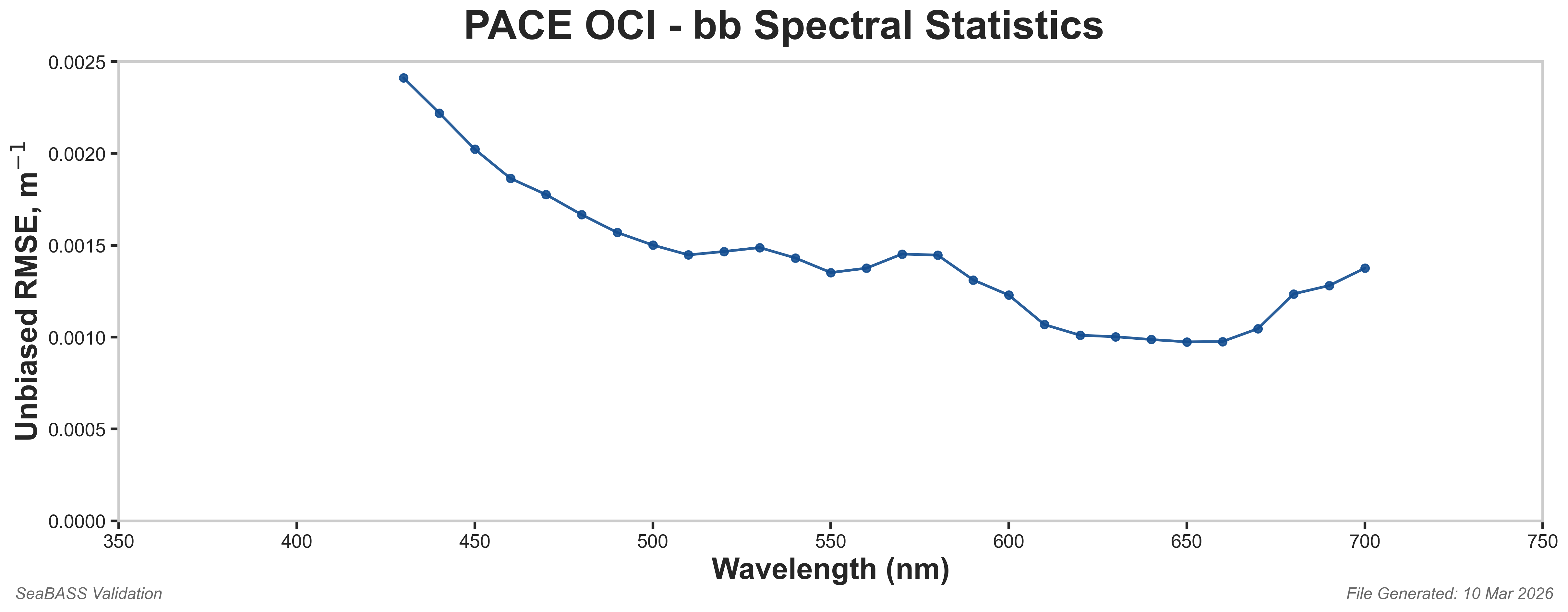 The backscattering coefficient (bb, units: m-1) quantifies light that is scattered into a backwards-facing hemisphere relative to the path of an incoming beam of light. Field measurements of bb are routinely measured in the visible range with fixed-angle volume scattering function (VSF) sensors at multi- or hyperspectral resolutions following community best practice. PACE OCI derives hyperspectral of bb using the GIOP-DC* algorithm.