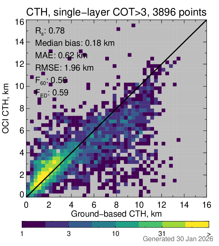 Summary plots and metrics are presented for three categories: single-layer opaque (visible optical thickness > 3) clouds; optically-thin (<3) clouds; and multi-layer clouds. Summary metrics are given in the table below for the data set as a whole. These include the number of matchups; fraction of matchups agreeing within the 60 mb goal for single-layer opaque clouds (F60); fraction of matchups agreeing within the expected discrepancy defined by retrieval and ARM uncertainty estimates (FED); Spearman's rank correlation coefficient (RS); and the median OCI-ARM bias, median absolute error (MAE), and root mean square error (RMSE), all in km.