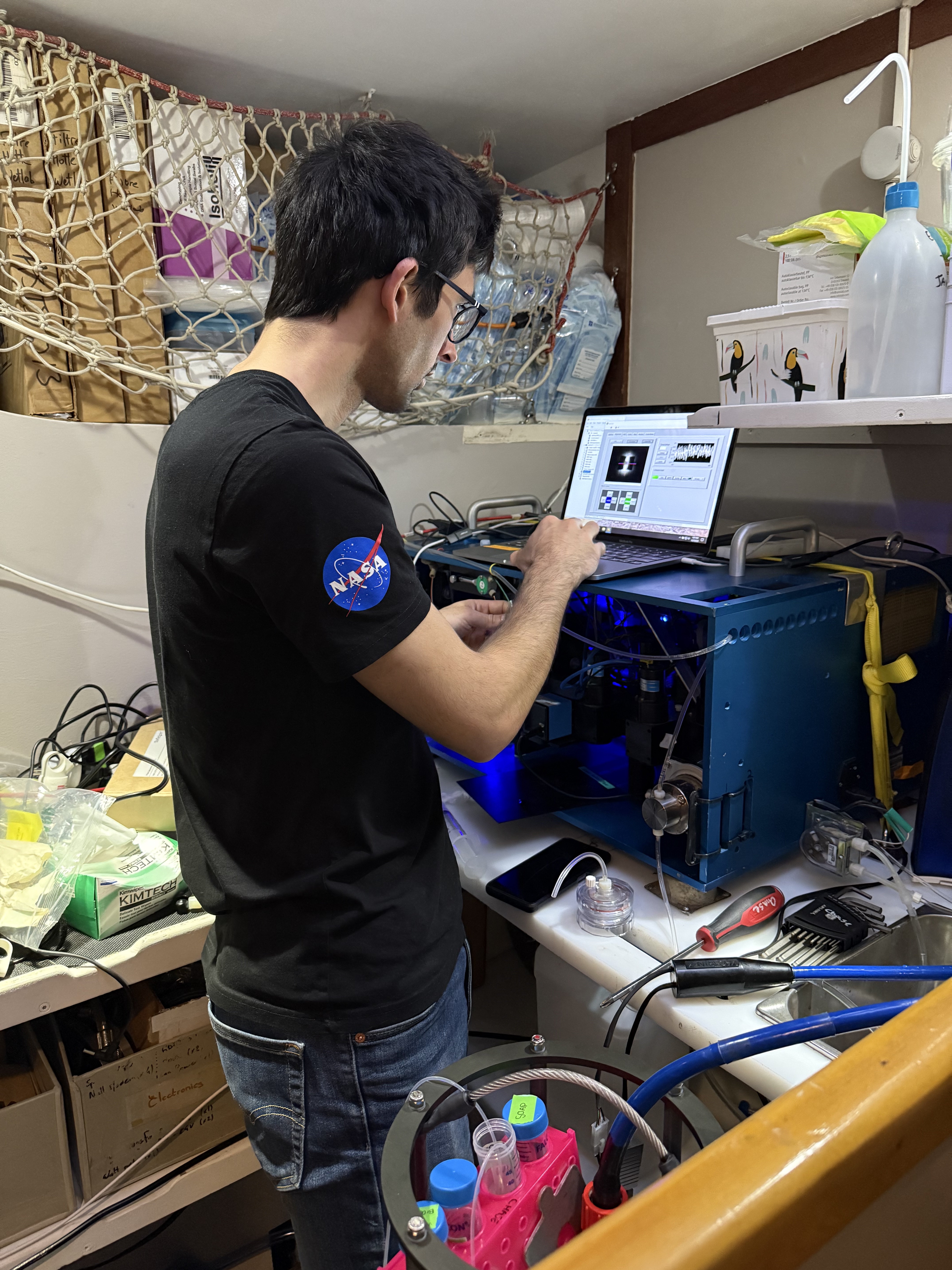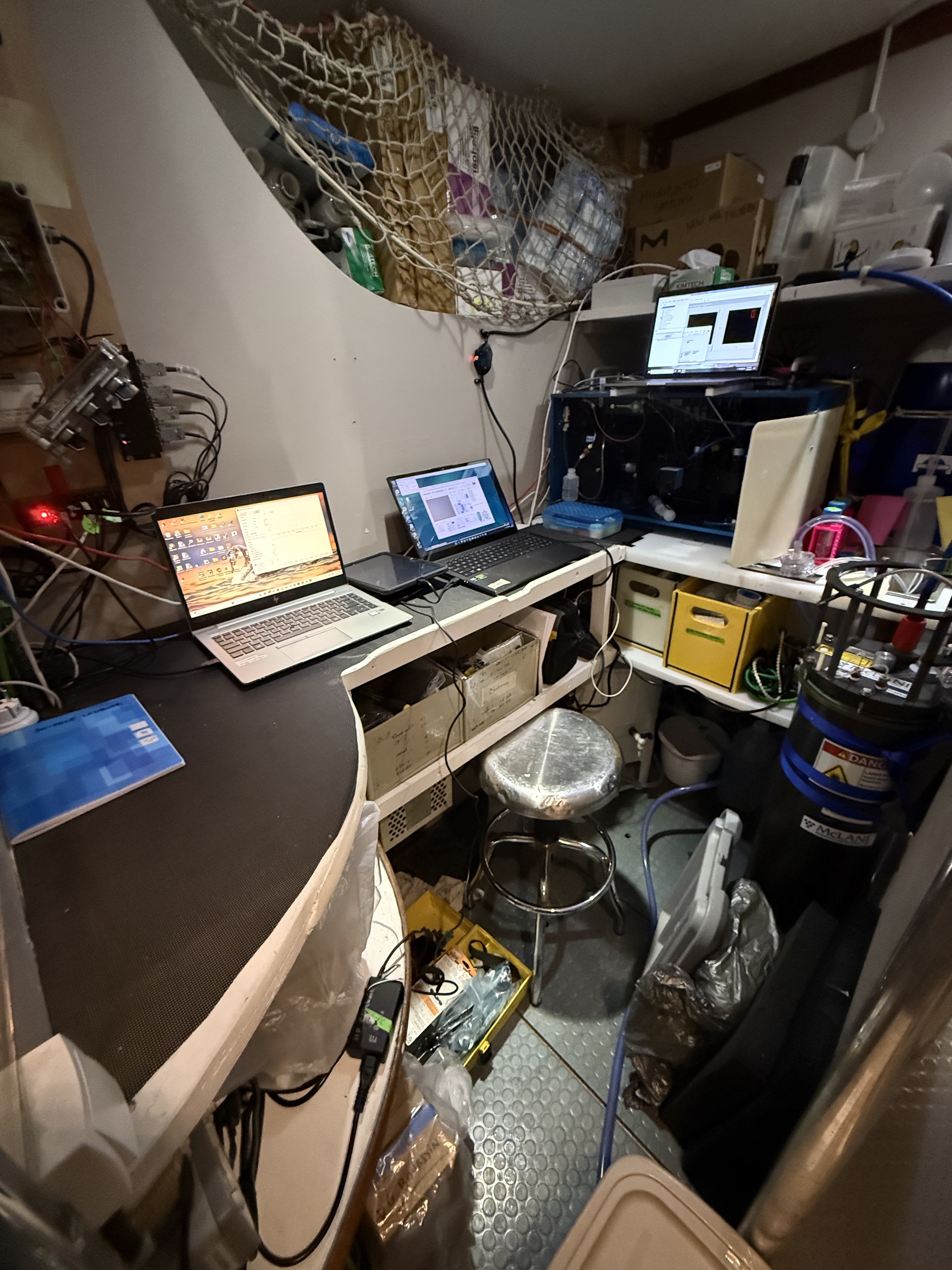 Crew members aboard a CalCOFI cruise wear masks during sampling operations due to smoke from the January 2025 LA County wildfires.