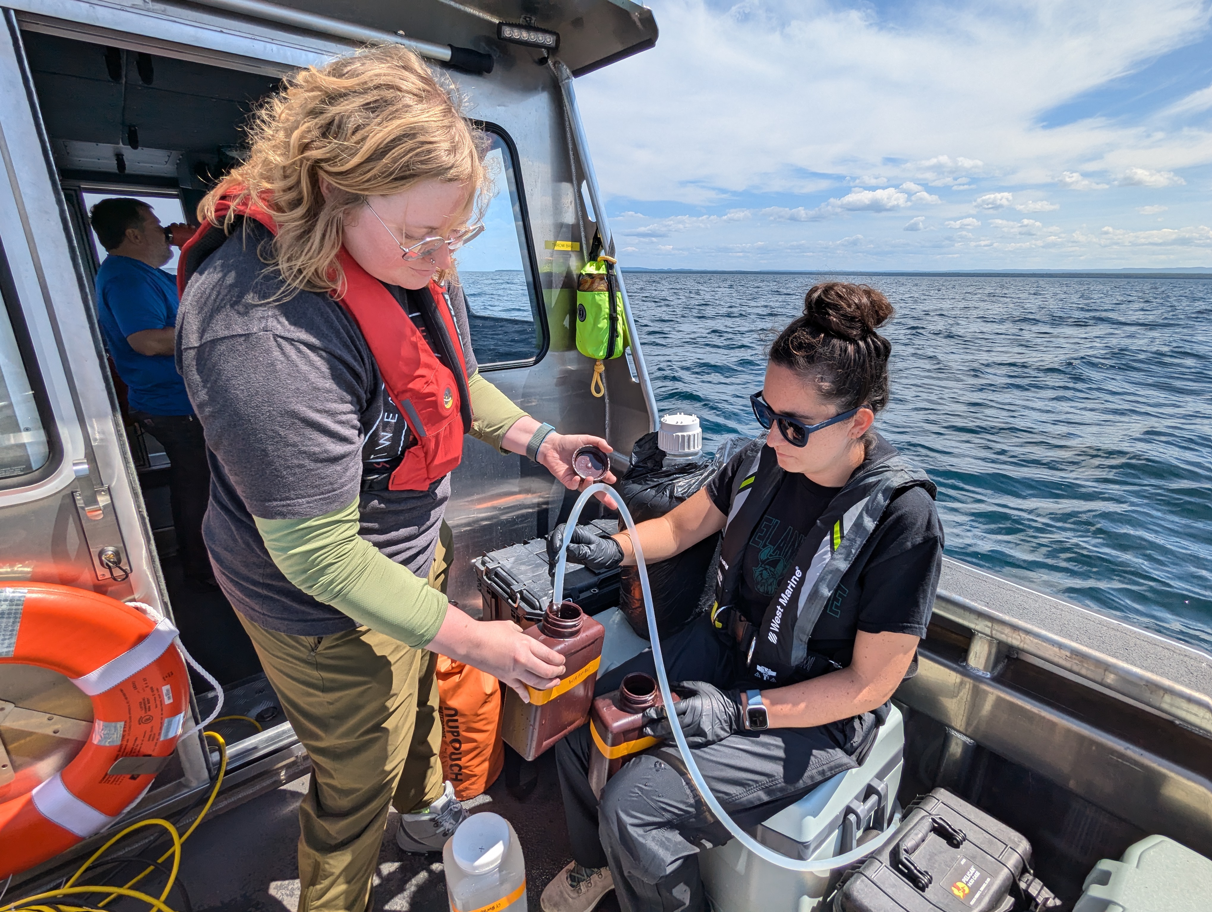 Kendra Herweck and Emily Hyland pouring off water samples to take back to the lab for filtering in Green Bay. With a special pelican guest!