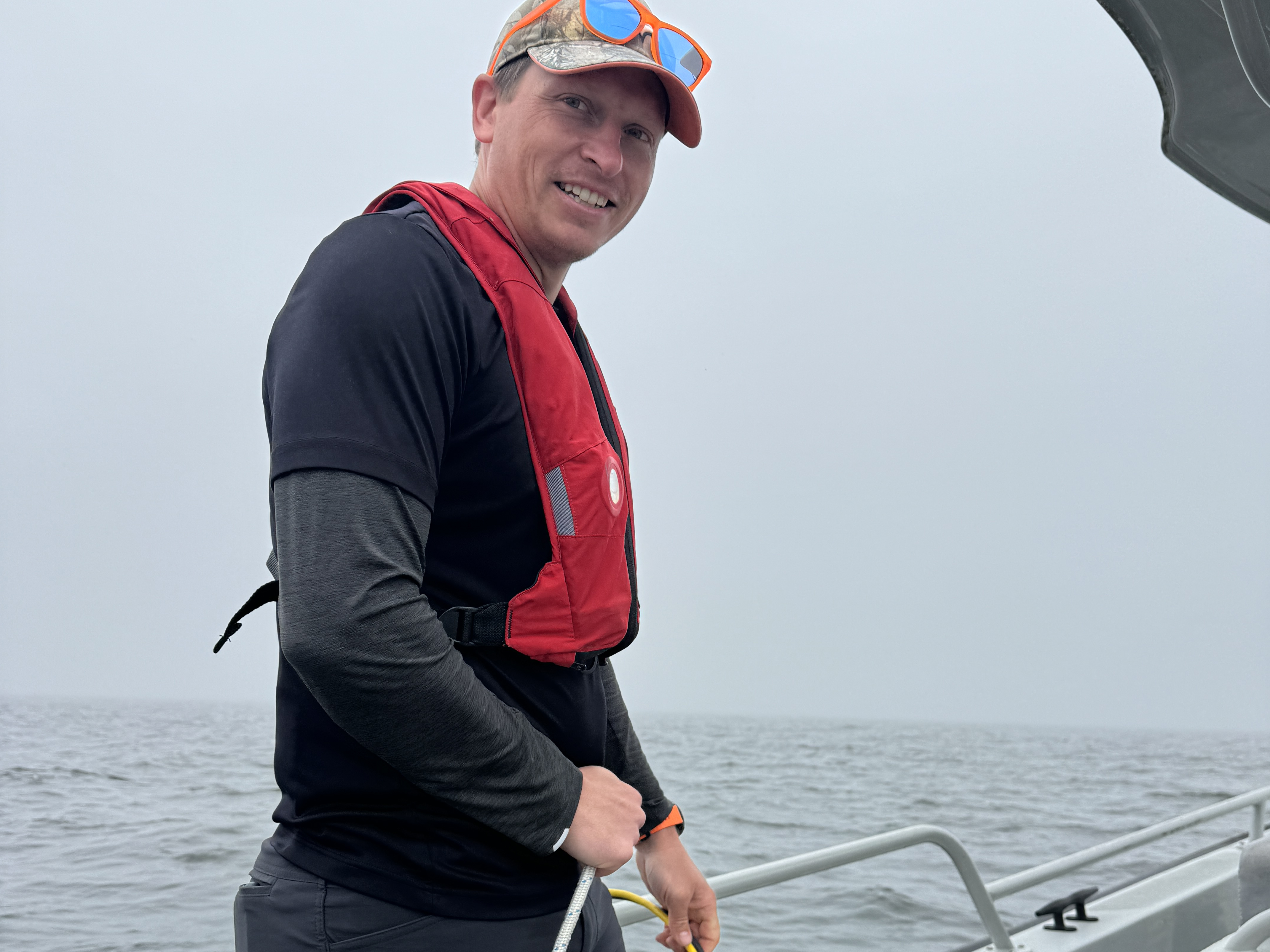 Dr. Brice Grunert on the R/V Phoenix in Green Bay, collecting a depth profile with a Sequoia hyper-bb and YSI EXO2 sonde