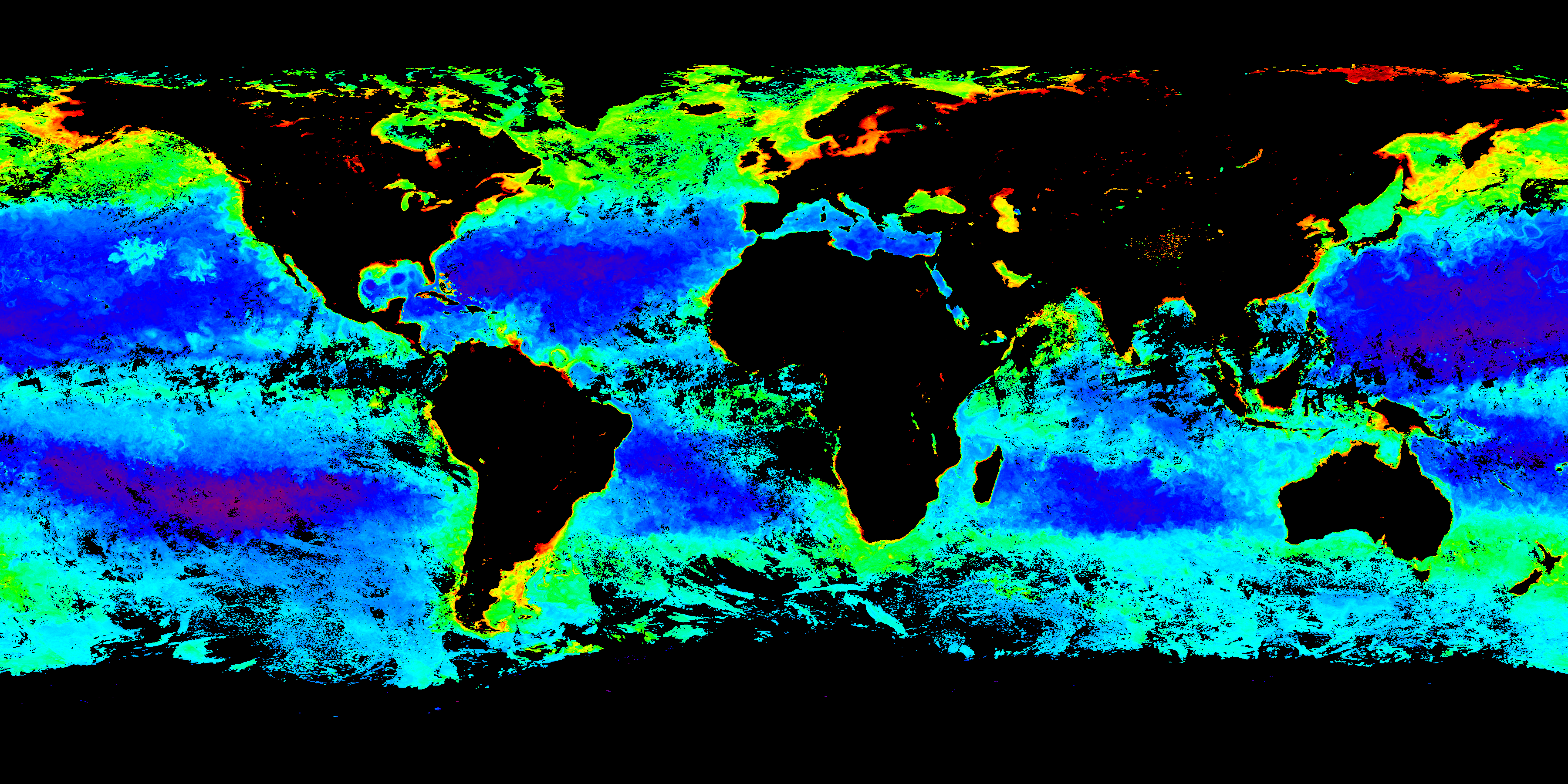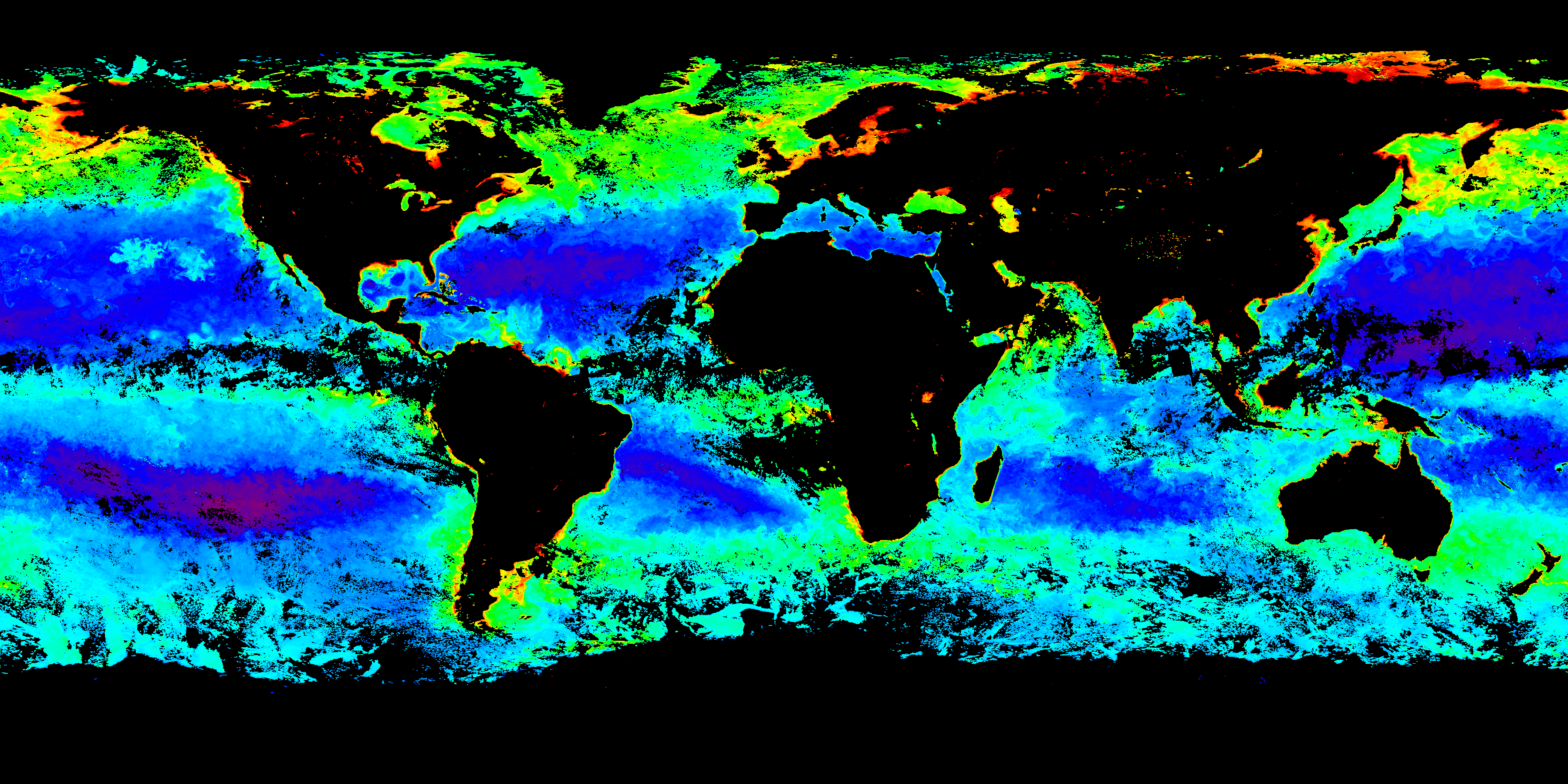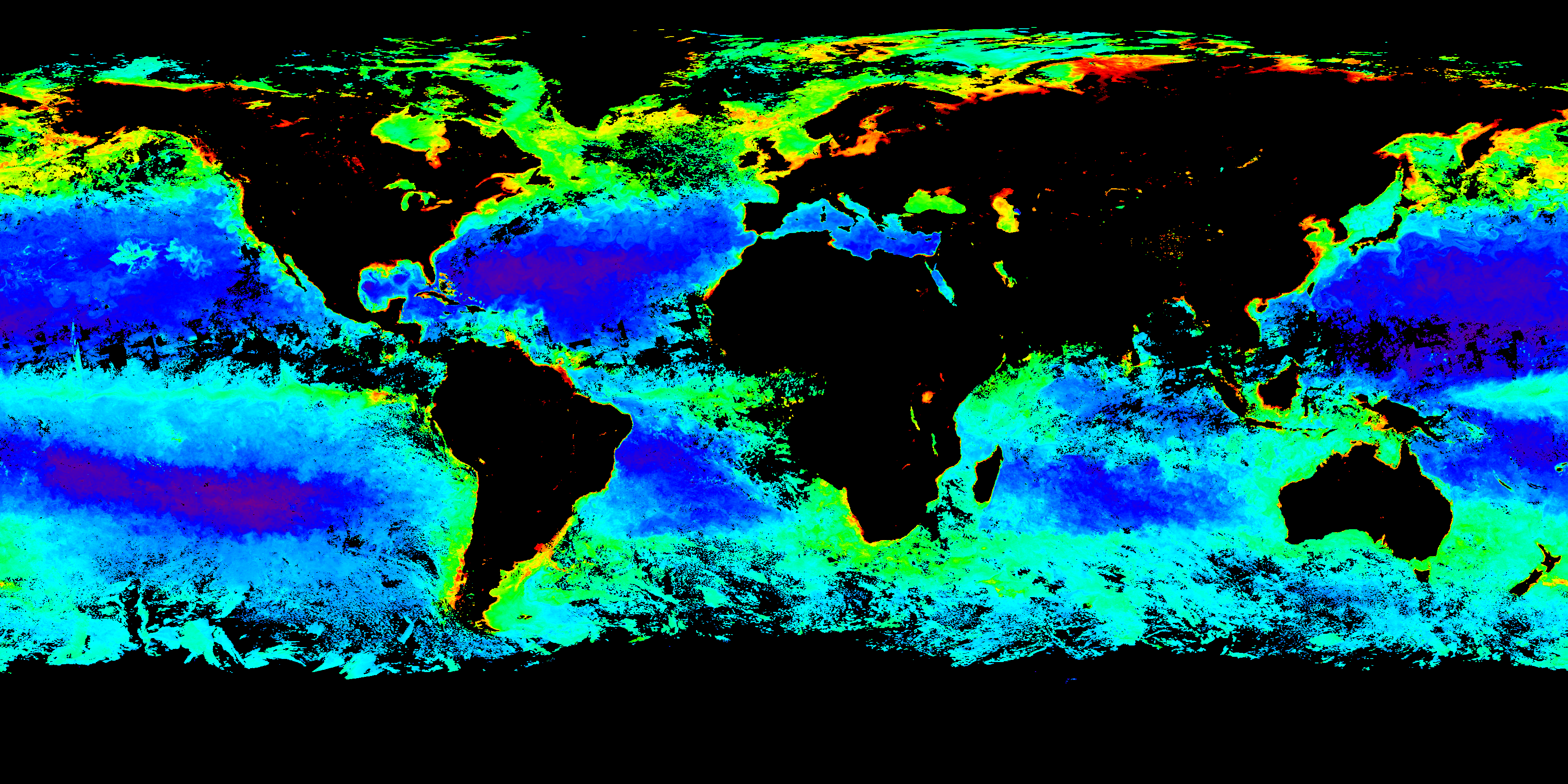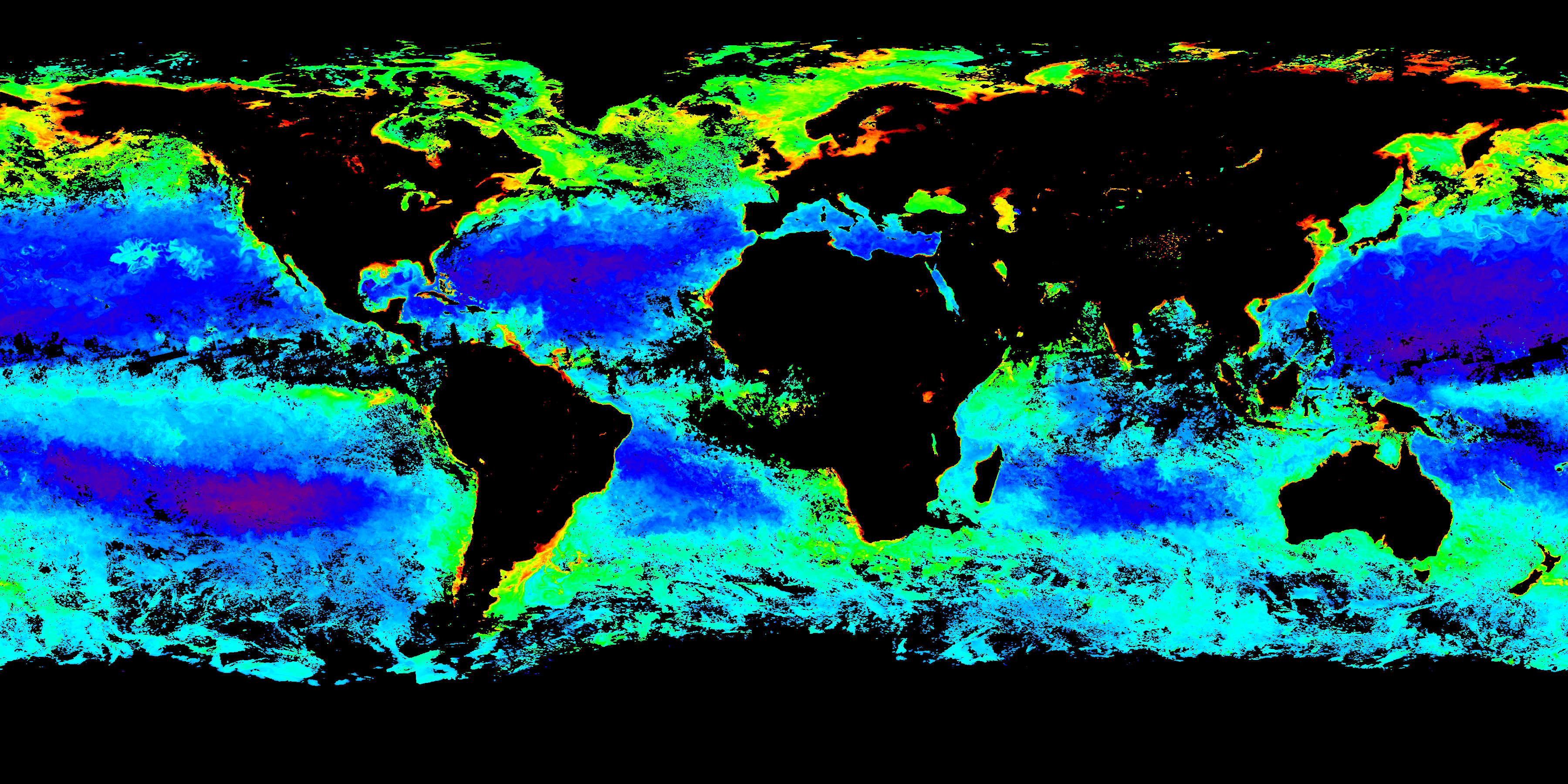 Colors in these provisional products indicate the concentration of chlorophyll in our ocean averaged over eight days. Click on the images (below) for a closer view. From there, you can click the left/right arrows to move between maps.